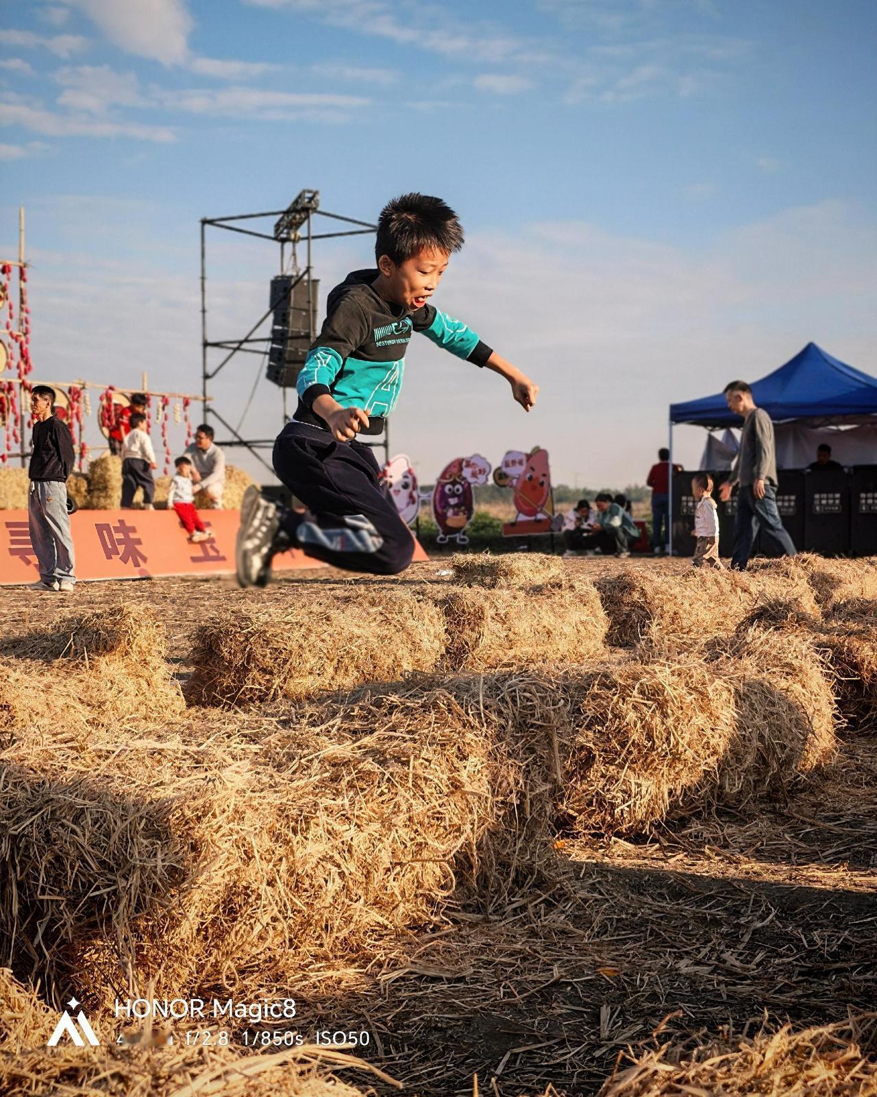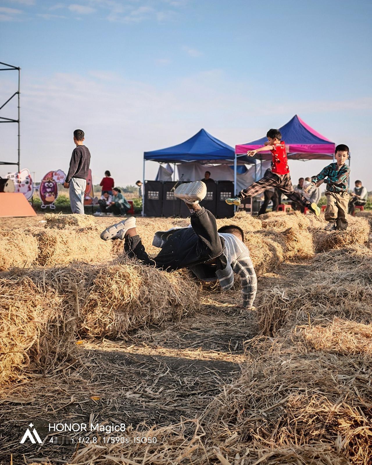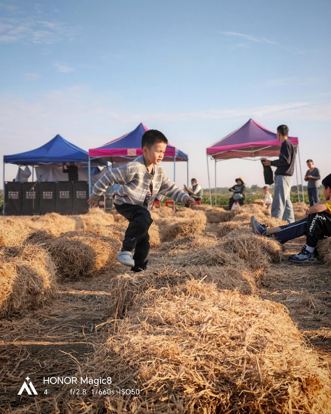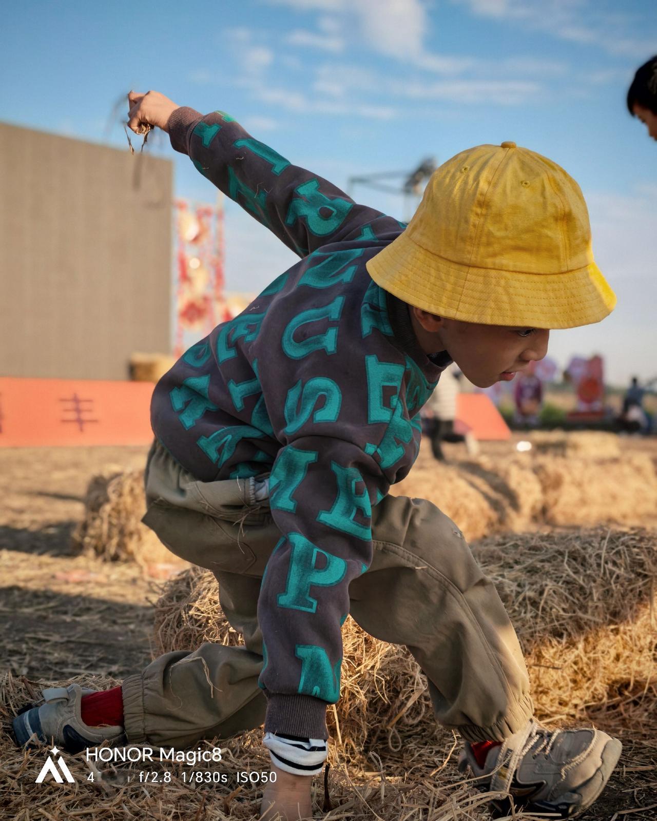 荣耀Magic8抓拍了几张小孩在草垛上跳跃的照片,发现成片质量真的很高。先说明一下:没有使用鹰眼抓拍模式,而是用48mm焦段随手拍摄的。得益于全新的影像硬件和算法优化,成功捕捉到了孩子奔跑跳跃的精彩瞬间。 摄影 荣耀Magic8 荣耀手机 手机