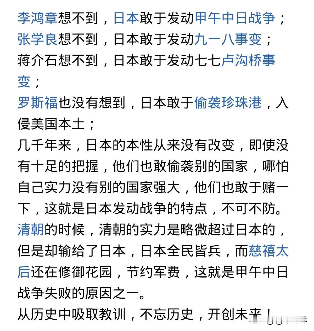 时刻提醒大家一句: 只有你想不到的,没有日本不敢想的,没有日本不敢做的。没有永远的朋友,只有永远的利益。甲午中日战争、九一八事变、卢沟桥事变、珍珠港事件都是我们不敢想的,但日本确实敢这样做。千百年来,日本的本性从来没有改变,对于一个赌徒来说,不在于手里的“牌”有多大,而在于赌徒为了赢不择手段,即使没有十足的把握,为了利益也敢去侵略别的国家。历史证明,任何忽视日本这个民族的,都将会遭受沉重的代价。现如今本就不牢固的中日关系被高市早苗搞得支离破碎,一系列的行为很难让人不胡思乱想,不得不防!