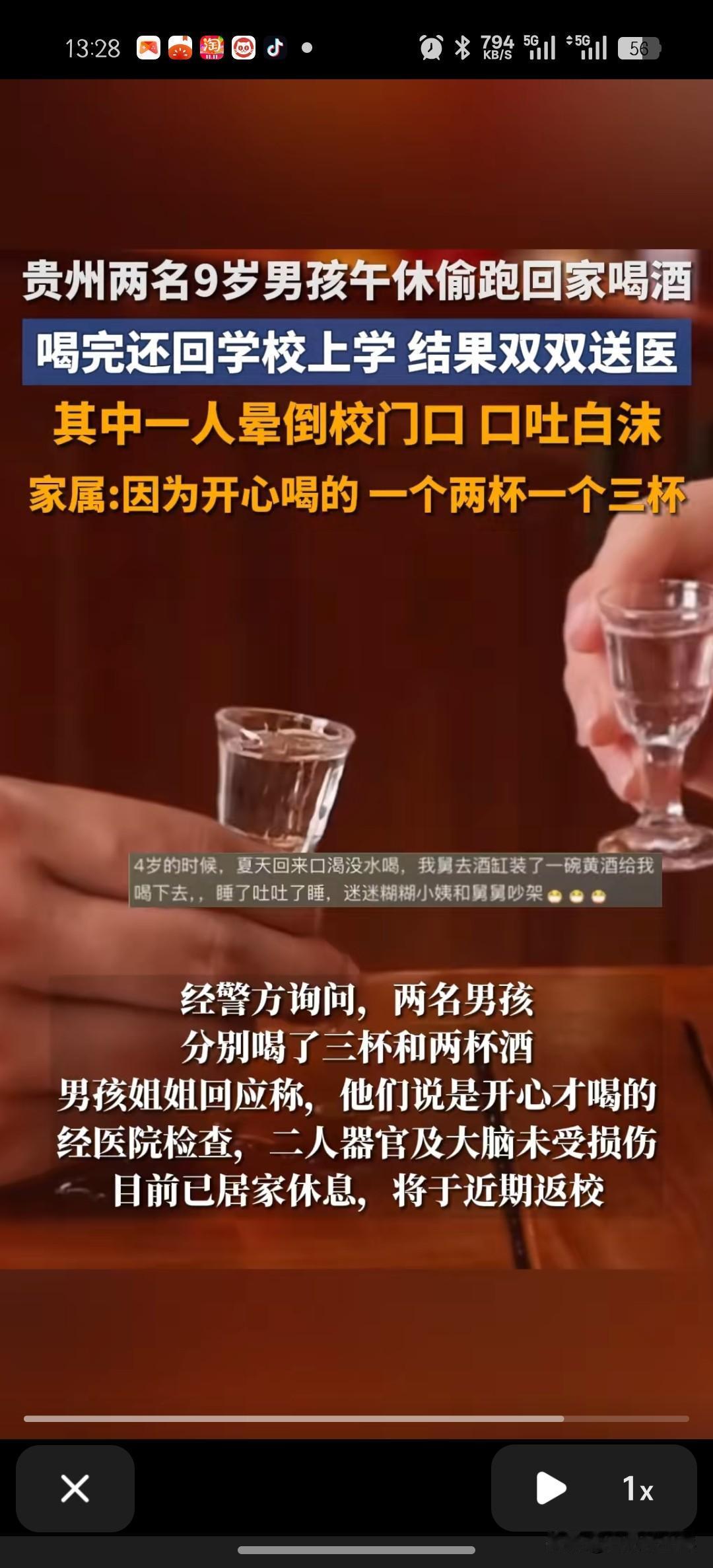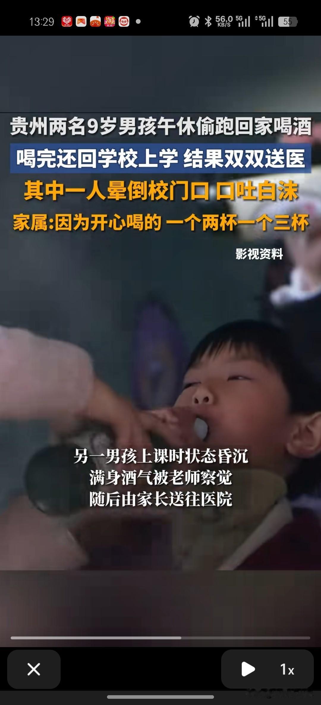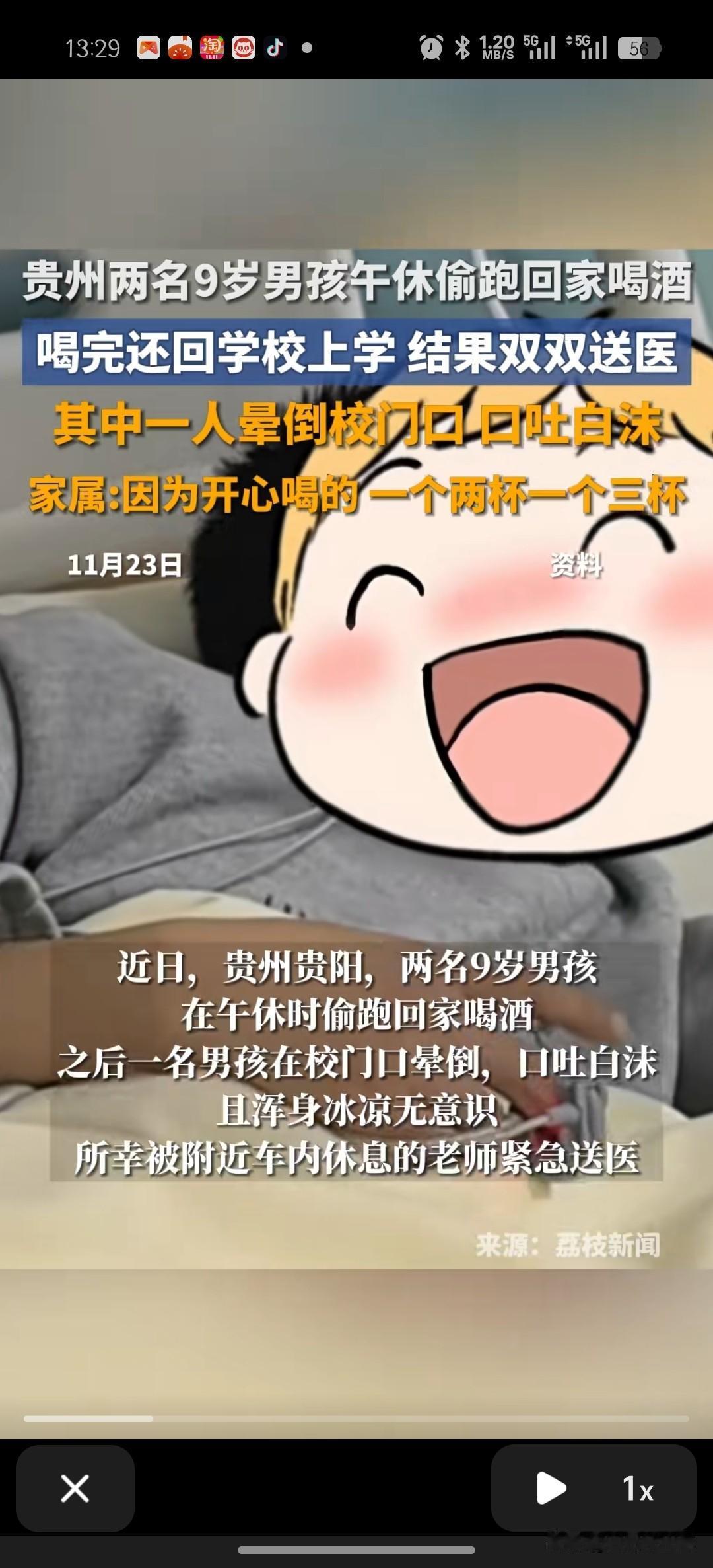 “无知者无畏!”11月23日,贵州两名9岁男孩午休偷跑回家喝酒 喝完还回学校上学结果双双送医。 其中一人晕倒校门口口吐白沫,所幸被附近车内休息的老师紧急送医,另一男孩上课时状态昏沉,满身酒气被老师察觉,随后由家长送往医院。 家属:因为开心喝的一个两杯一个三杯! 11月23日中午,贵州贵阳一所小学的教室里,同学们都趴在桌上准备午休,两名9岁的男孩却凑在一起小声嘀咕,趁值班老师转身整理资料的间隙,悄悄从教室后门溜了出去,沿着学校围墙外的小路快步往家走——他们的家就在学校隔壁的小区里,步行只要12分钟。 推开家门时,家里大人都在上班,客厅里安安静静的,两人径直走到电视柜旁的矮柜前,打开最下层的抽屉,里面放着一瓶还剩大半的白酒,是家里长辈上周聚餐时没喝完的。男孩们之前看过大人用小玻璃杯喝酒,觉得很有意思,今天正好趁家里没人,想学着试试。 他们翻出两个平时用来喝果汁的透明小玻璃杯,拧开酒瓶盖子,一股辛辣的味道飘了出来,先给个子稍高的男孩倒了满满一杯,接着又给另一个男孩倒了一杯,两人端着杯子碰了一下,学着大人的样子仰起头喝下, 辛辣的液体滑过喉咙,烧得两人直咧嘴,但还是你一杯我一杯地喝了起来,个子高的喝了三杯,另一个喝了两杯,喝完还把酒瓶塞好放回抽屉,用纸巾擦干净杯子上的指纹,才拍拍衣服跑回学校。 刚走到学校正门口的台阶旁,喝了三杯酒的男孩突然脚步踉跄了一下,扶着旁边的树干站了几秒,接着身体一软就倒在了地上,四肢开始轻微抽搐,嘴角流出白色的泡沫,脸色发白,浑身冰凉没有一点反应。 正好有位教数学的老师在车里休息,听到路过学生的喊声,立刻推开车门跑过来,蹲下身摸了摸男孩的颈动脉,又试了试呼吸,赶紧从包里拿出手机拨打120,同时喊来校门口的保安一起守着男孩,直到急救车赶到。 另一名喝了两杯酒的男孩,强撑着走进教学楼,刚爬上三楼的楼梯就开始头晕,扶着扶手歇了半分钟才走进教室,趴在桌子上就不想动。 上课铃响后,语文老师走进教室点名,喊了他三次都没回应,走到他身边才闻到一股明显的酒气,男孩的脸颊通红,眼神涣散,老师赶紧联系他的家长,又让同学帮忙把他扶到办公室的沙发上休息。 家长赶到学校时,男孩已经连说话都含糊不清,抱着他往医院跑的时候,男孩还吐了一地,身上的酒气更重了。 警方后来找到两名男孩了解情况,两人说当时就是觉得“开心,想试试大人喝的东西是什么味道”,不知道会晕倒。男孩的姐姐说,弟弟回家后没提喝酒的事,自己下班回家看到客厅的抽屉没关严,才发现酒瓶里的酒少了。 医院的急诊室里,医生给两名男孩做了抽血检查,结果显示酒精浓度都超过了成人的醉酒标准,立刻安排洗胃和输液,还做了脑部CT和肝功能检查。 经过两个多小时的处理,男孩们的意识逐渐清醒,医生说幸好送医及时,两人的器官和大脑都没有受到不可逆的损伤,只是需要在家休息一周,每天喝蜂蜜水和米汤缓解肠胃不适。 家里人把所有的酒都锁进了卧室的衣柜里,还特意买了一本关于儿童安全的绘本,晚上陪着男孩们一起读。学校也在第二天的晨会上,让校医给所有学生讲了酒精对身体的伤害,提醒大家不要接触任何含酒精的饮品。 目前两名男孩已经在家休息了三天,每天都会由家长带着散步,精神状态一天比一天好,医生说再过四天就能返回学校上课。 对此,你们有什么看法,欢迎评论留言~