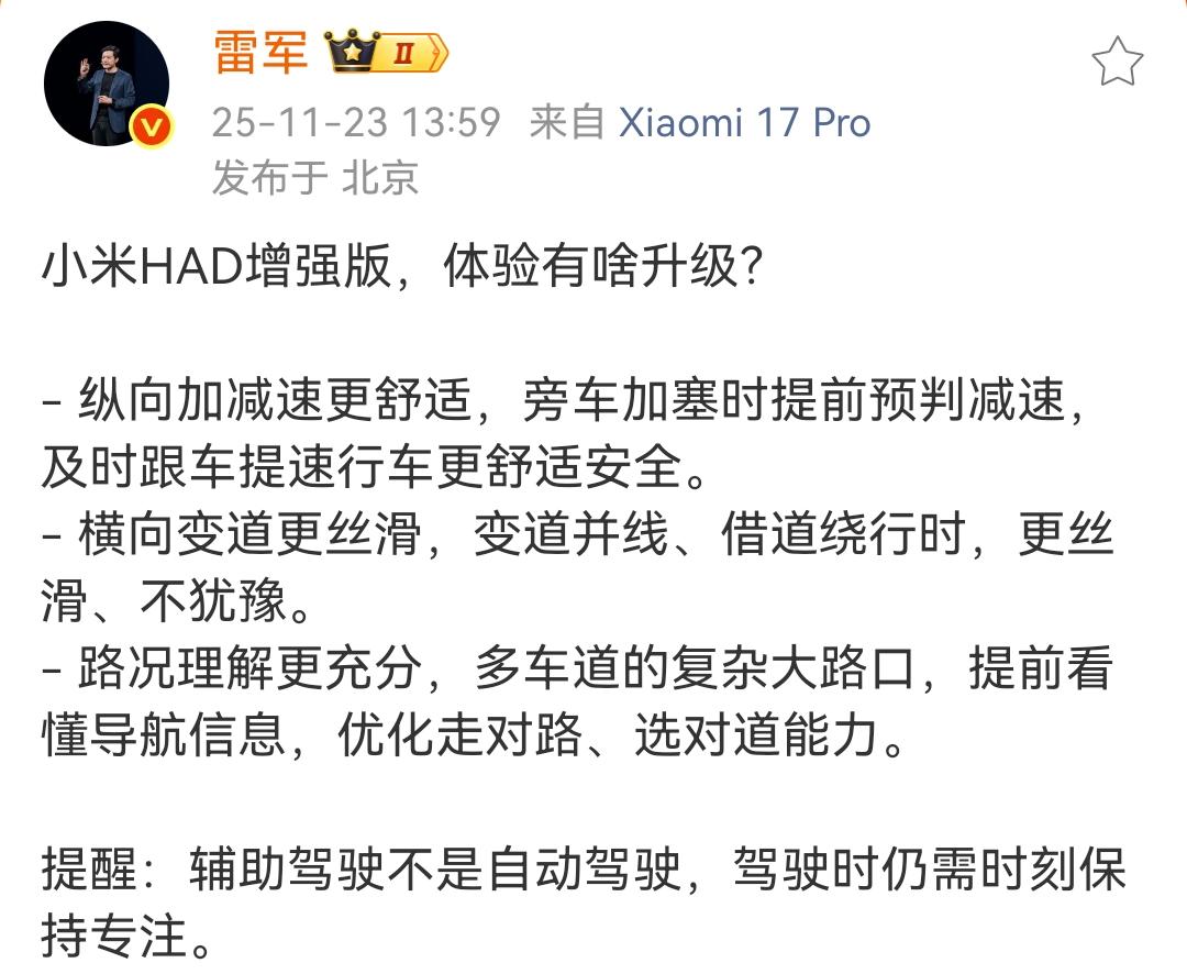 雷军:小米HAD增强版,体验有啥升级? 纵向加减速更舒适,横向变道更丝滑,路况理解更充分。 这几个功能点加上了之后,都是小米的智能驾驶水平更像人开的而不是机器所开的,相当于辅助驾驶功能拥有了“思考”的能力,可以根据现场的实际情况做出准确的判断,就相当于人开车的时候也会根据环境作出判断一样。 同时雷军还着重提醒了,辅助驾驶不是自动驾驶,驾驶时仍需时刻保持专注。 各位是怎么看的?欢迎评论区留言。