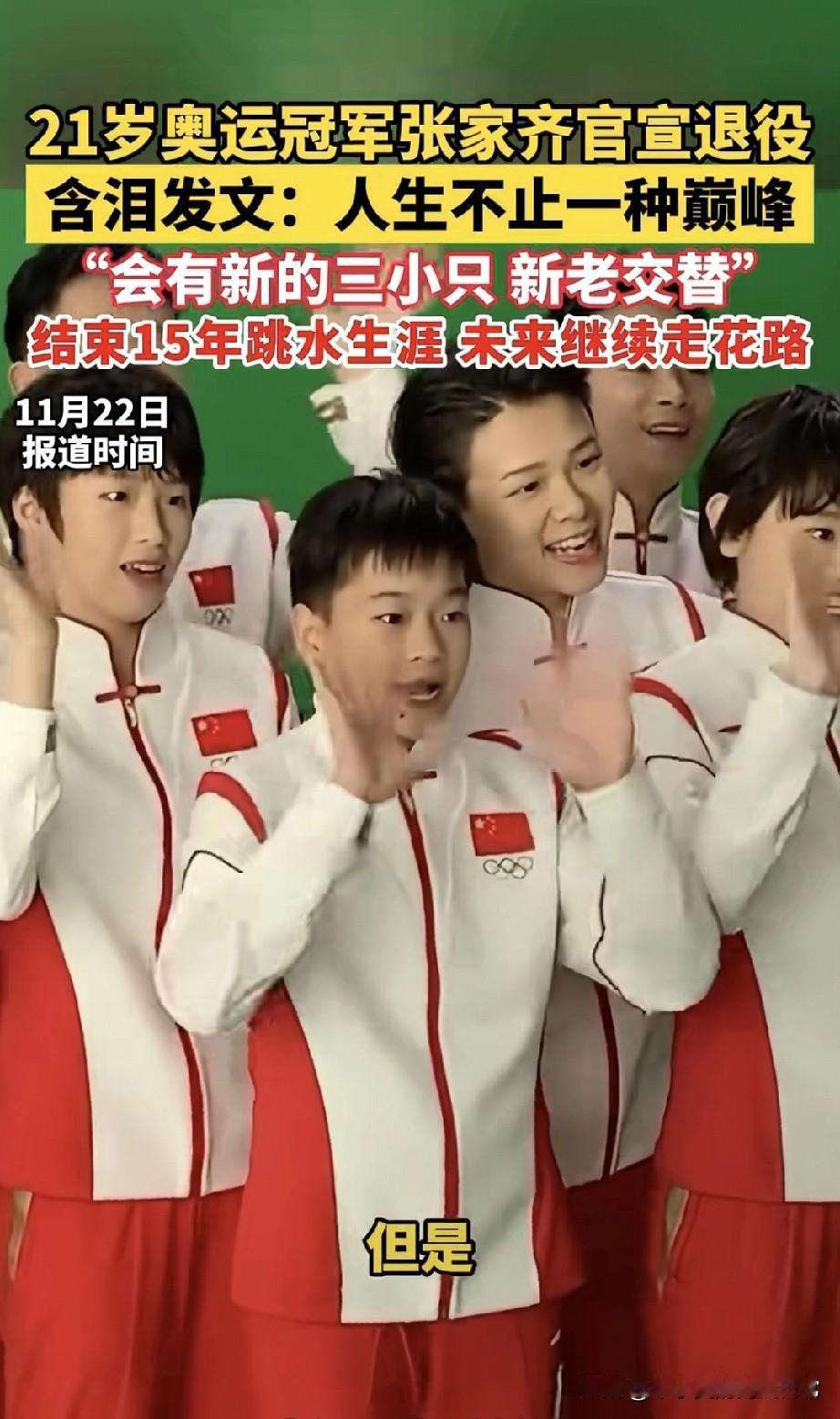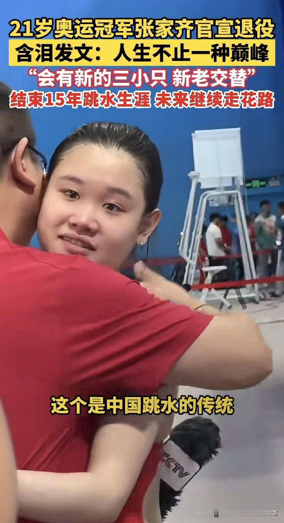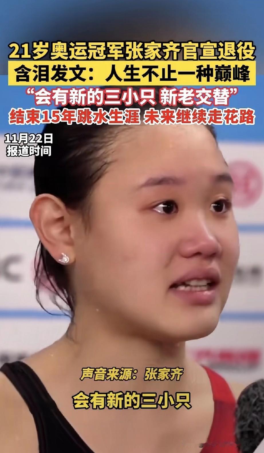 21岁的张家齐,哭着和15年跳水生涯说再见了。 镜头里她红着眼眶说“会有新的三小只”,台下那身印着国旗的队服,还沾着刚结束比赛的水汽。14岁拿世界冠军、17岁奥运摘金,她把最好的年纪扎进泳池,如今转身时,连拥抱都带着水花的温度。 有人说“21岁退役太可惜,巅峰期不该停”,也有人懂:跳水台的水花再小,也抵不过日复一日的伤病和疲惫。可咱也忍不住想:当“新老交替”成了传统,这些年轻冠军的退路,真的够宽吗? ——你觉得她该拼到伤病缠身,还是该体面转身去闯新巅峰?