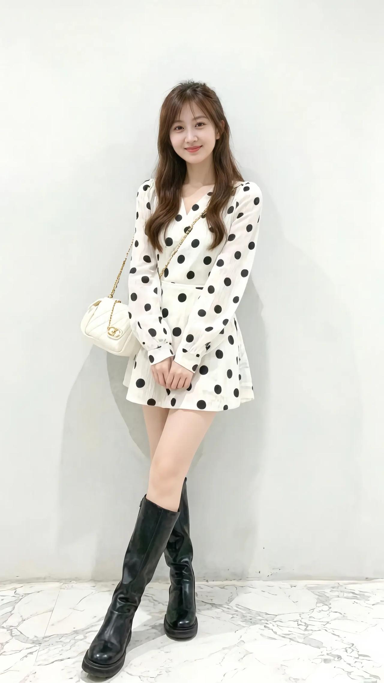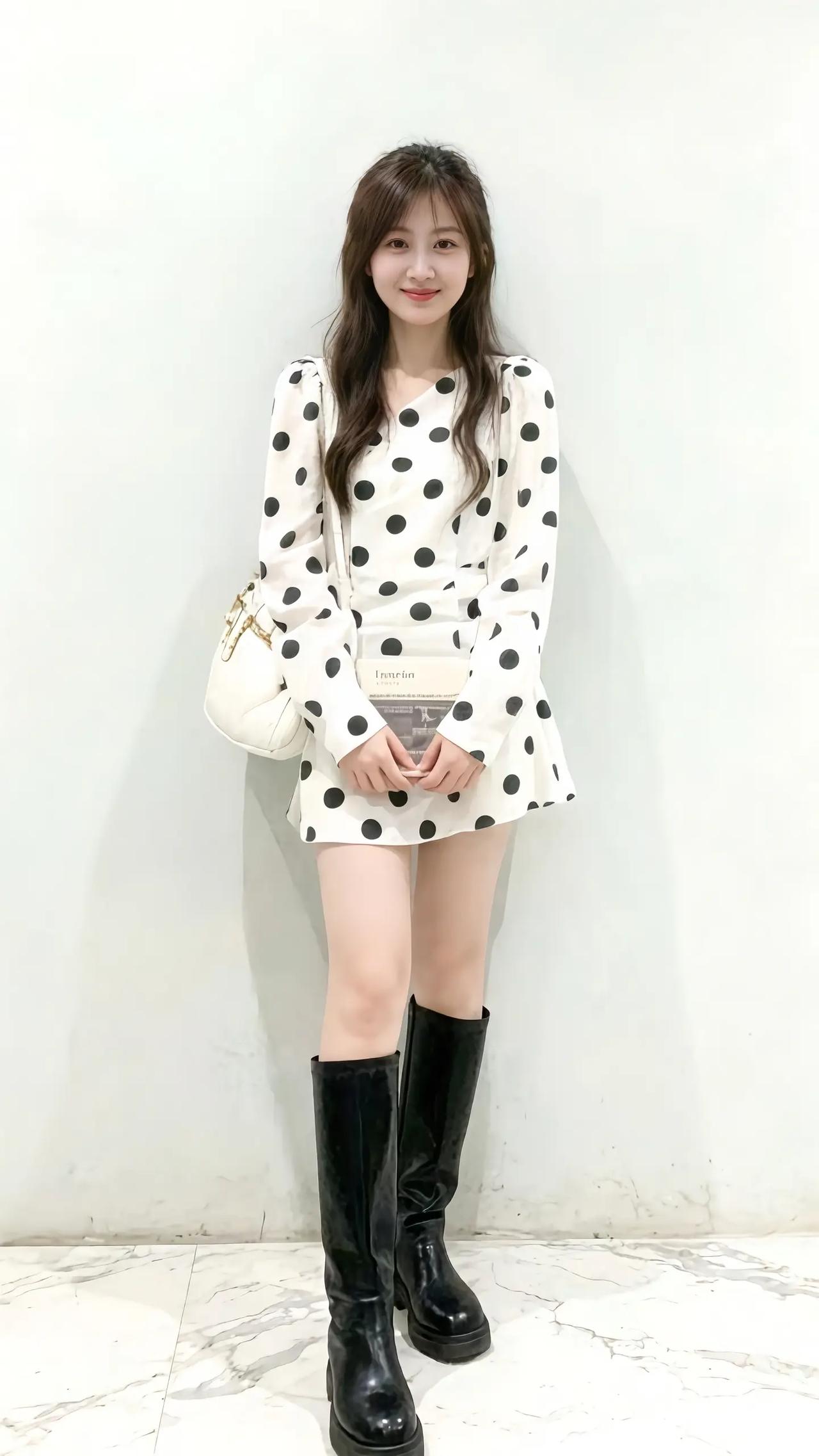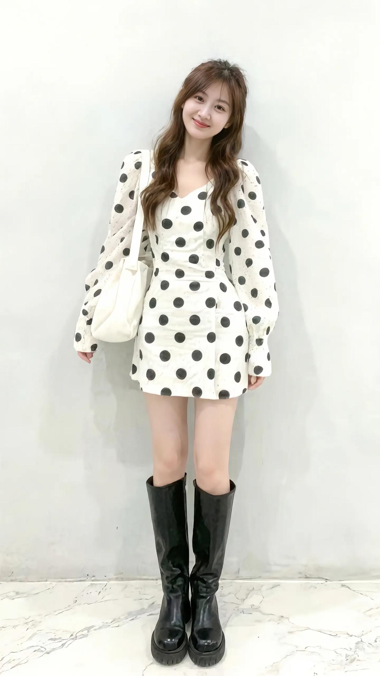 女人如何穿出含蓄的性感? 甜美波点连衣裙搭配黑色靴子,元气少女风!👗👢