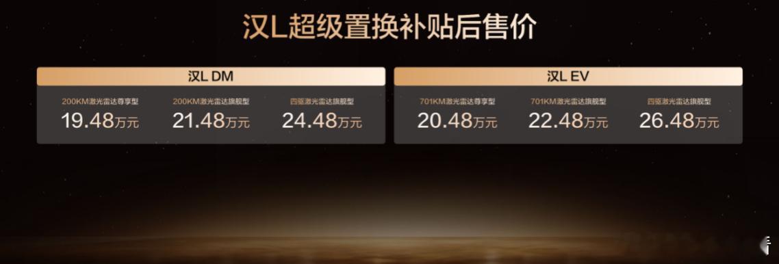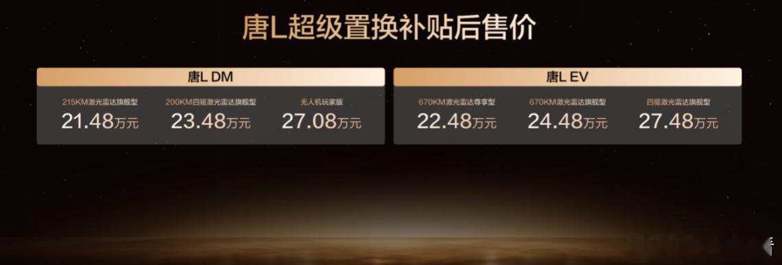 比亚迪汉L唐L补贴后19.48万元起,新增车色+OTA同步升级在今年广州车展上,比亚迪带来了汉L、唐L的最新升级,包括全新车色、OTA功能以及更实用的智能配置。新车补贴后售价19.48万-27.48万元外观部分,两款车型新增橄榄绿车色,汉L还多了西子蓝选项。同时,汉L推出黑化运动套件,唐L支持琉光银选装,定制化选择进一步增多。动力系统上,汉L EV、唐L EV全面搭载超级 e 平台,全域千伏高压架构让补能速度有了明显提升:5 分钟补电约 400 公里。混动版同样升级到第五代 DM 技术,综合续航最长可达 1430 公里。此外,智能化能力是这次升级的另一重点。全新 DiLink 150 座舱 UI 更简洁,主题氛围更生活化。辅助驾驶系统新增“车位到车位”领航辅助,用户只需设置导航路线,车辆便会自动驶出车位,抵达目的地后,系统还能自动寻找并泊入空余车位。值得一提的是,比亚迪还强化了生态合作,包括家庭互联、智能家电联动,以及儿童座椅、宠物座舱等周边设备,进一步延伸用车场景。 (原创/欢欢)
