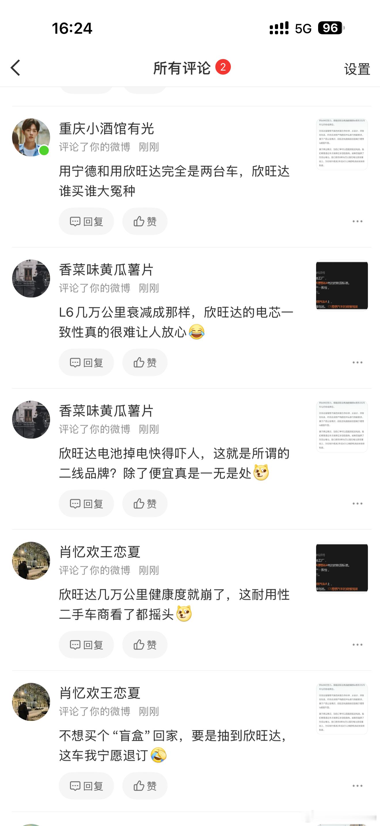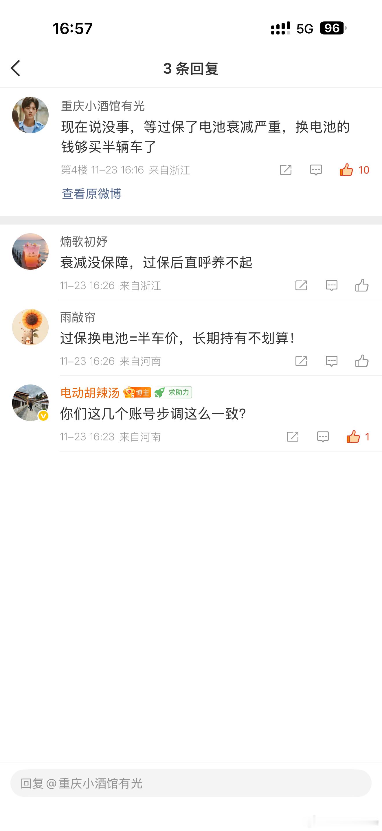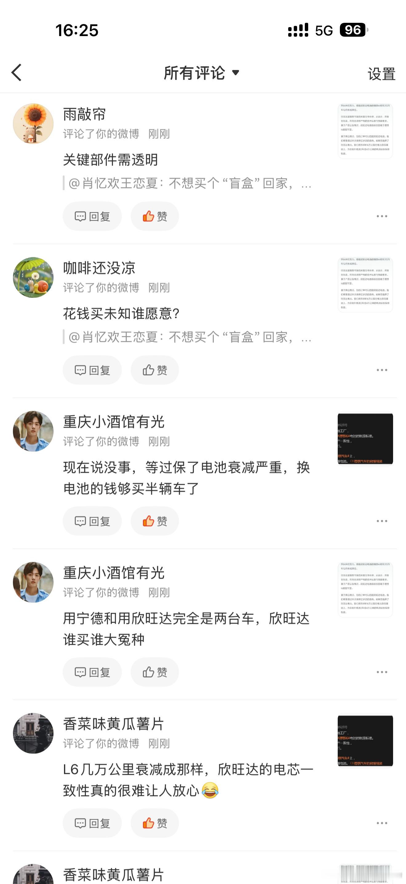这两天发了两条关于理想i6配欣旺达电池的内容…本身也没啥特殊的,但评论区步调很一致,然后我点开了这几个账号的主页,他们的主页热门微博,点过的内容都出奇的一致!不用怀疑了,这就是水军账号,步调一致,措辞一致,话术一致,营造出一种广大网友都这么认为的假象!理想i6的电池版本上给了购车者选择的机会,你愿意选择欣旺达版本可以得到两年延保,甚至交车时间也许也会变短,而你喜欢宁王,就可以等等宁王的电池…