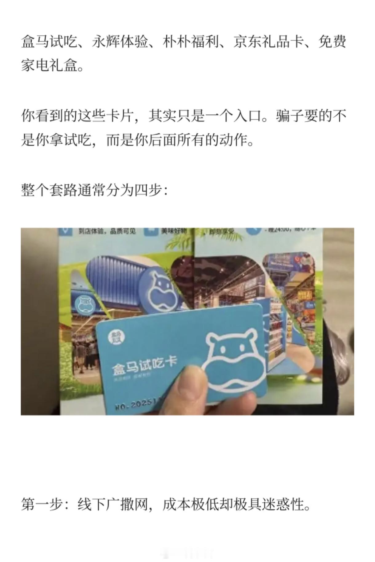 试吃卡、试用卡基本都是骗局!免费午餐藏着隐形账单,天降馅饼多是精心设局。挣钱不易,别让贪心栽了跟头。