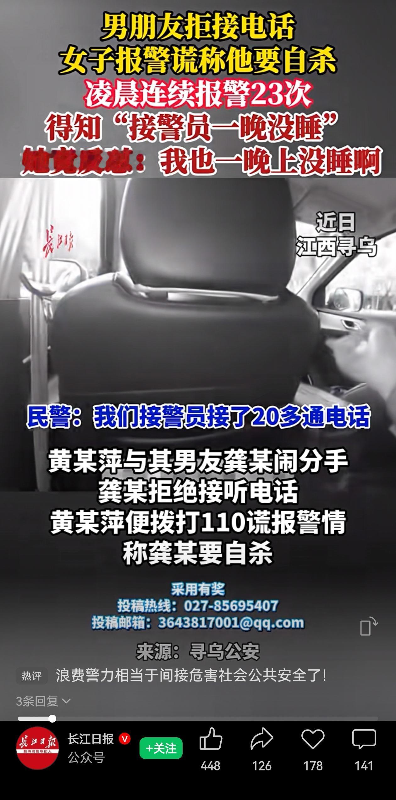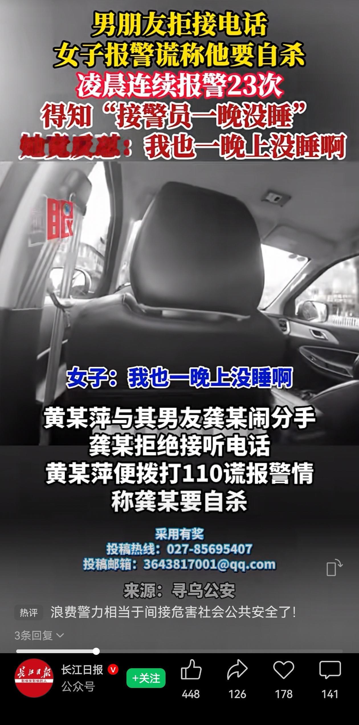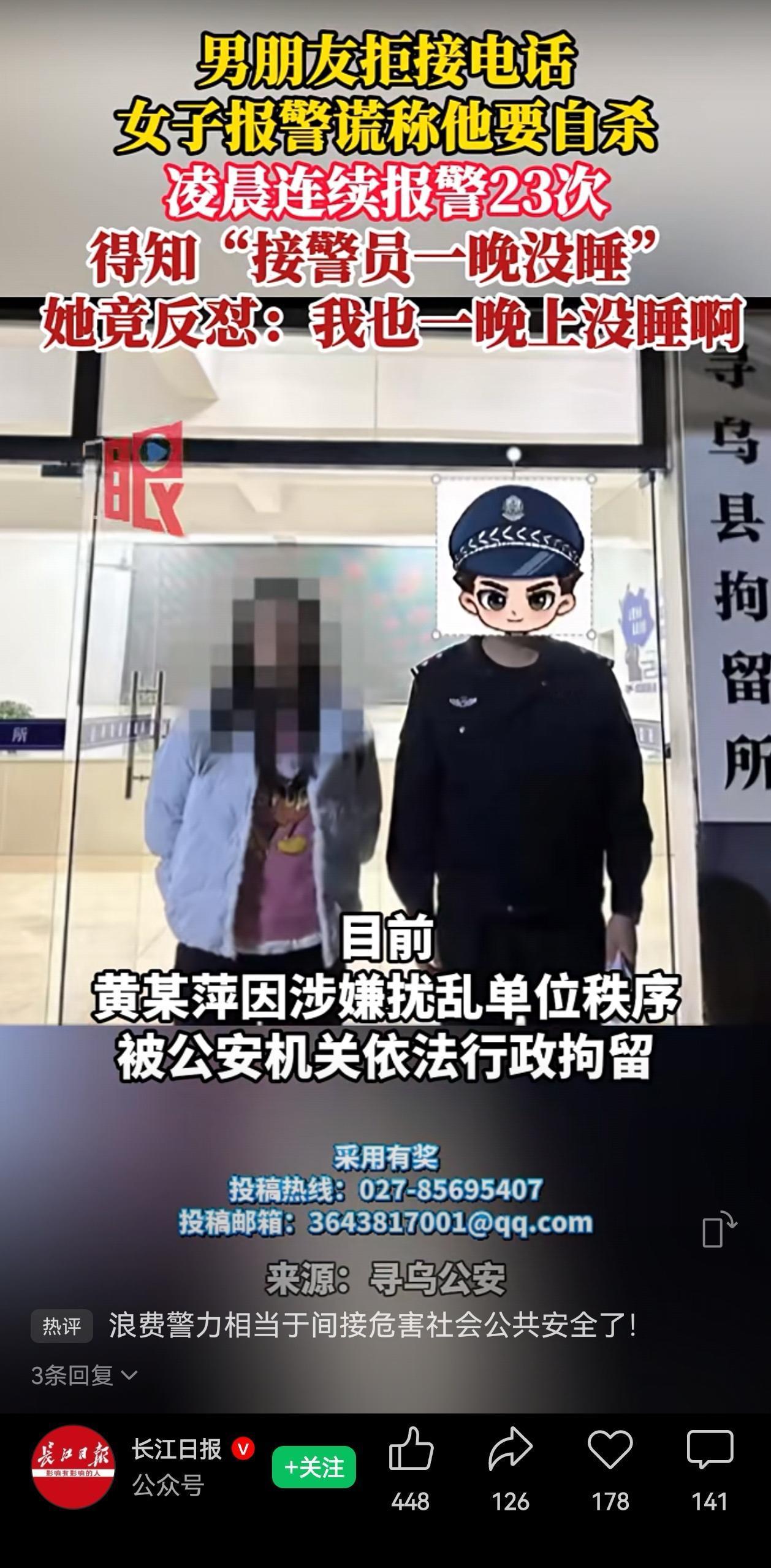 110哪是想打就打的?江西寻乌有个女孩,男朋友不接她的电话,居然把110当私人热线使,一晚上不停劝阻,连续打了23次假报警,说自己男朋友要自杀,就为了逼男朋友接电话? 接警员因为她这一通折腾,整晚没法休息。当警察找到她时:“我们接警员接了20多通电话,一晚上没睡”。 结果她居然大声反呛“我也一晚上没睡啊”!这逻辑简直了,你自己作,不睡,还要拉上等着救命的公共资源陪绑? 典型的“世界只有我,全世界都得围着我转”养大起来的孩子吧!真该醒醒了! 家里惯着长大不等于全社会都得顺着你。为了逼男朋友现身,就能理直气壮地占用救命热线,这已经不是简单的任性,而是自私自利了。 该长大了!拘她的警察说得好:“成年人了,要为自己的行为负责”!这次被行拘就是个教训:社会不是爸妈,没人会无限包容你的胡作非为。否则下次等着你的,可不止是几天拘留这么简单了。 任性可以放任,违法却需要确确实实负责了,好好在拘留所反省几天,慢慢想下怎么让男朋友,愿意接电话吧! 信息来源:长江日报