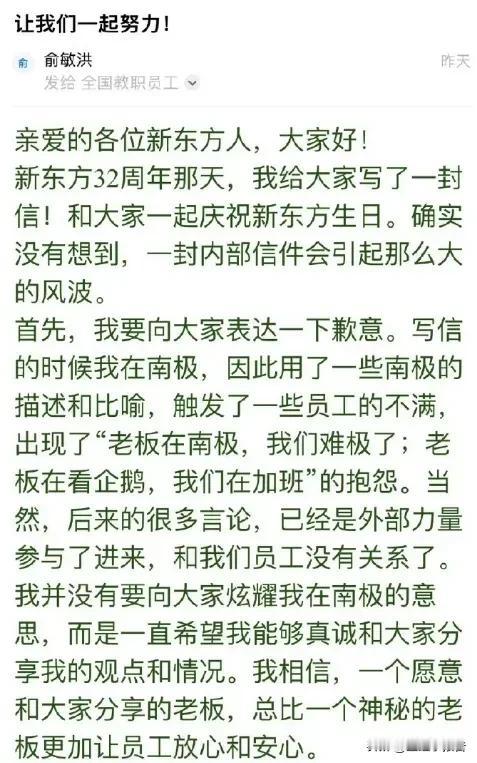 俞敏洪南极一封信引起了新东方不少基层员工的吐槽,根本原因在于作为老板的俞敏洪缺乏与员工共情。 俞敏洪在南极的那封信如果发给新东方管理层还是比较合适的,但不太适合发给上万新东方一线教职工。对于普通员工来说,公司提供富有竞争力的薪酬待遇比万语千言都更加有效。 基层员工需要的是实实在在的东西,而不是鸡汤和爽文。但我从俞敏洪的道歉信中却干撒到俞敏洪的些许孤傲,老板熬夜,承担风险这理所应当,而且老板的收益是普通员工的几十几百倍,这个不具有可比性,也没有必要去讲这些。俞敏洪 新东方 俞敏洪旅行随笔 (图片引用自网络)