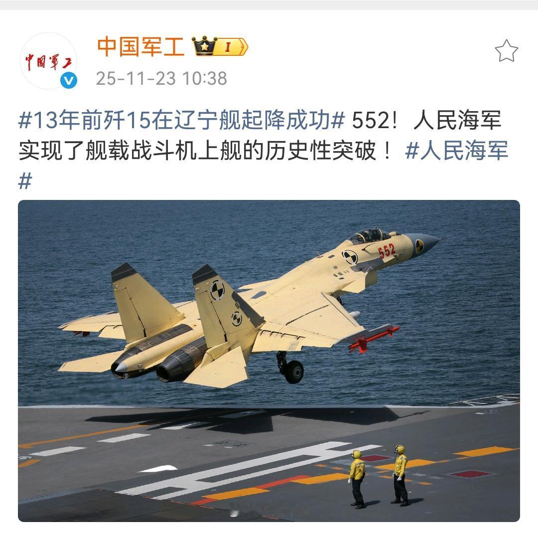 中国军工:13年前歼15在辽宁舰起降成功! 552!人民海军实现了舰载战斗机上舰的历史性突破 ! 时间过得真快转眼都13年过去了,现在已经拥有3艘航空母舰了,这个速度确实也是没有想到的。 大家能想象到未来的13年咱们还会多增加三艘航空母舰吗?如果放在13年前想象应该不会想象这么快。 各位是怎么看的?欢迎评论区留言。