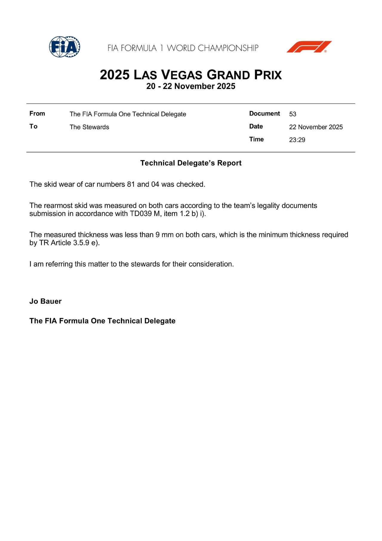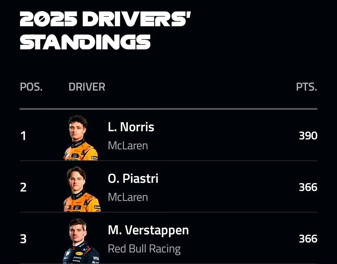 让子弹飞一会儿!结果大反转……迈凯伦双车的底板木板磨损过度,被上报至赛事仲裁,已被取消比赛成绩! 官方重新更新了积分。是不是很刺激,维斯塔潘要逆袭夺冠了,没有什么不可能。还记得那年抢汉密尔顿的那个冠军吗? 迈凯伦双车DSQ,一切按照既定剧本发展,FIA是潘子的亲爹…… 附积分榜:诺里斯390、皮亚斯特里366、维斯塔潘366。