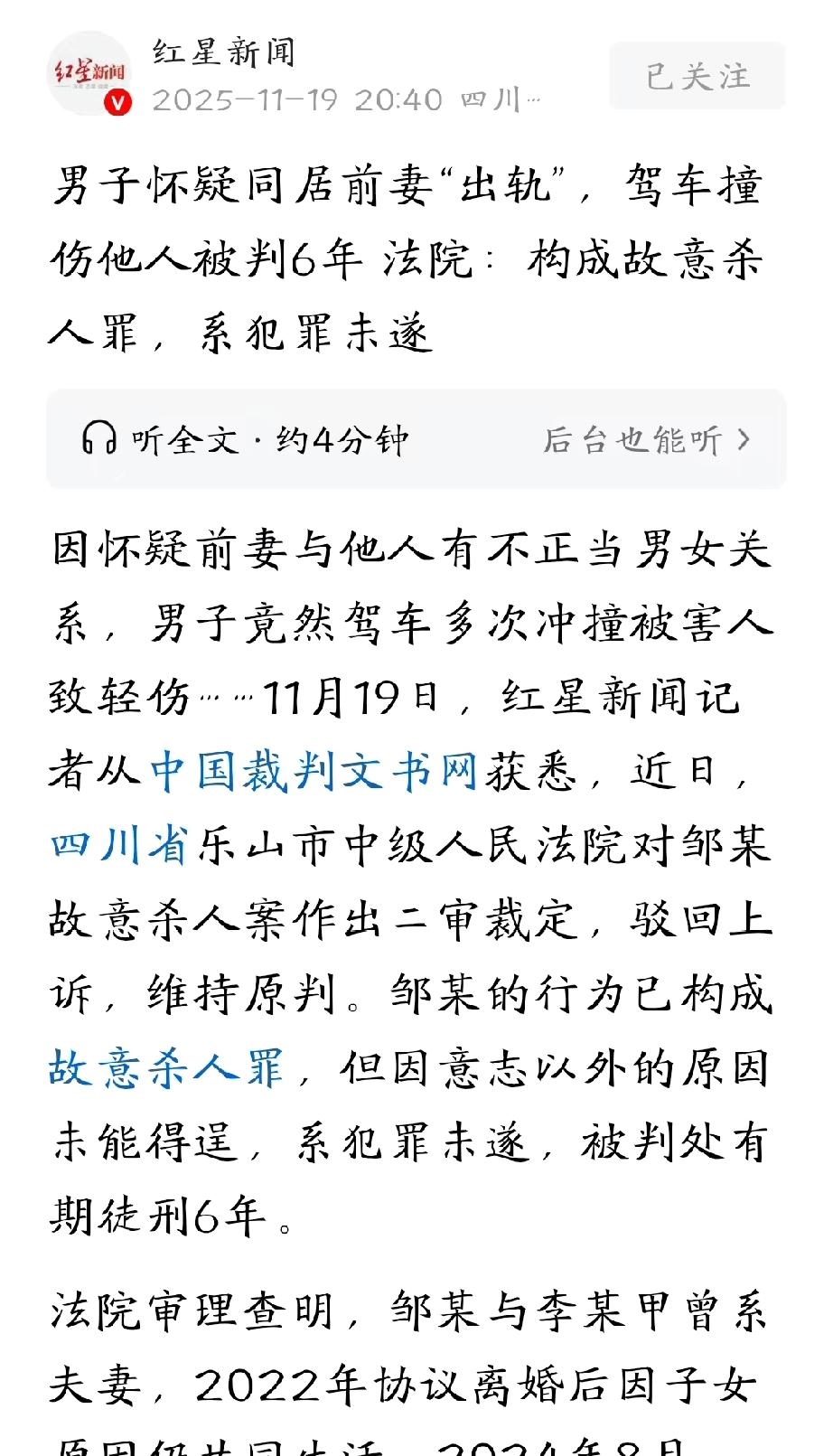 四川乐山,男子和妻子感情不和离婚,但为了孩子考虑,离婚不离家,依然共同生活。两年后,男子发现前妻经常夜不归宿,甚至带其他男人回家过夜,他瞬间心生恨意,产生了报复心理。于是,他揣着一把匕首,开车撞翻情敌,见他倒地呻吟,又倒车继续碾压。幸亏对方反应快,藏到了车缝里,男子没有放弃,多次撞击,好在没有撞上人,撞坏了好几辆车。事后,他假装交通事故报警,但通过警方调查,男子悲剧了。 2022年,邹某和妻子李某因为感情问题办了离婚,但孩子还小,为了不影响孩子,两个人商定,继续同居生活,算是“离婚不离家”。 刚开始一切都很和谐,双方相安无事,可从2024年8月开始,邹某突然发现前妻李某多次很晚回家,有时候甚至夜不归宿。 他心里越来越不是滋味,甚至忍不住胡思乱想,总觉得前妻在外面有人了。 按理来说,他们两人已经离婚,邹某就不应该管李某的事情,毕竟人家有再恋爱交往的自由,可邹某心里就觉得抓心挠肝的不舒服。 于是,邹某悄悄去查了前妻的通话记录,这一查,还真让他发现了问题,李某和一个叫冯某的人联系特别频繁。 更让他火大的是,他调取小区监控发现,冯某居然在9月25日晚上来过他家。 这下邹某彻底认定,这两人肯定有不正当关系。他越想越气,心里那股火压都压不住,甚至心生恨意,就想找冯某报复。 10月8日下午一点多,邹某揣着一把匕首,开车出门去找冯某。 他一路打听,得知冯某在当地一个快递仓库工作,就直奔目的地,果然,在仓库附近的路口,他看见冯某正开着快递三轮车出来。 邹某二话不说,一脚油门加速撞了上去,三轮车当场被撞翻,毫无防备的冯某也摔倒在地。 邹某下车一看,发现冯某还在呻吟,没有死,他不但没有停手,更没有施以援手,反而回到车上,倒车想再碾一次,以解心头之恨。 幸好冯某反应快,赶紧躲到了旁边一辆车后面,这才逃过一劫。 他倒车时速度太快,又把另一辆等红灯的三轮车给撞翻了,幸好那辆车的司机张某跳车及时,才没有受伤。 冯某吓傻了,为了保命,他赶紧躲到两车的车缝里,但邹某已经被报仇冲昏了头脑,毫无理智,他又两次开车冲向冯某。 虽然没把人撞成重伤,但把旁边两辆小轿车给撞坏了。 一下撞坏了这么多车,邹某怕事情再闹下去无法收场,自己也赔偿不起,便打了120急救电话和122报警,谎称发生了交通事故。 交警赶到现场,邹某竟然大胆包天,没有说事情,试图隐瞒真相,直到民警调出监控,他才不得不承认自己是故意撞人。 后来经过鉴定,冯某身上有三处轻伤,包括左腿和右手骨折。 今年7月,法院一审认定,邹某犯了故意杀人罪,不过属于犯罪未遂,加上他后来坦白了部分事实,最终判了他六年有期徒刑,没收了作案工具越野车,并赔偿冯某医疗费、误工费等将近13万元,另外还要赔被撞车主的维修费2万多元。 邹某不服,提起了上诉。法庭上,他辩称自己只是想伤害冯某,并不是想杀人,应该算故意伤害罪,不是故意杀人。 而且,自己属于犯罪中止,甚至有自首和立功表现,对赔偿金额也有意见。 但二审法院认为,《刑法》第232条规定:故意杀人罪的核心是“故意非法剥夺他人生命”,主观上要求行为人明知自己的行为会导致他人死亡,且积极追求或放任该结果发生,客观上需实施足以致命的暴力行为。 本案中,邹某因怀疑前妻与冯某有不正当关系,心生报复恨意,携带匕首蓄意寻找冯某,其出发时就带有明确的报复加害目的。 当发现冯某后,未作任何沟通直接驾车撞击,且在冯某摔倒后仍意图倒车补碾,后续又两次驾车冲向躲藏的冯某,全程主动追求“致冯某于死地”的结果,主观杀人故意清晰且坚定。 其次,车辆属于具有高度危险性的工具,高速撞击人体足以直接导致死亡,邹某不仅首次加速撞击,还实施“倒车补碾加反复冲撞”的连续行为,手段极端且致命。 邹某停止犯罪的直接原因是“撞坏多辆车辆,怕赔偿不起、无法收场”,而非“主动放弃杀人”或“有效防止死亡结果发生”,属于犯罪未遂,不是中止。 若其属于犯罪中止,应在撞击后主动停止攻击、救助冯某,但邹某全程无任何悔罪或施救行为,完全不符合犯罪中止“自动性、有效性”的要求。 另外,他报警时没说真话,不算自首,也没有立功证据。 最终,二审法院维持原判,驳回了邹某的全部诉讼请求。 邹某实在是冲动又糊涂,既然离了婚,前妻和谁交往本是她的自由,两人只是为了孩子才继续同住,他却放不下执念,最后不但自己坐了牢,还赔上一大笔钱,真是得不偿失。