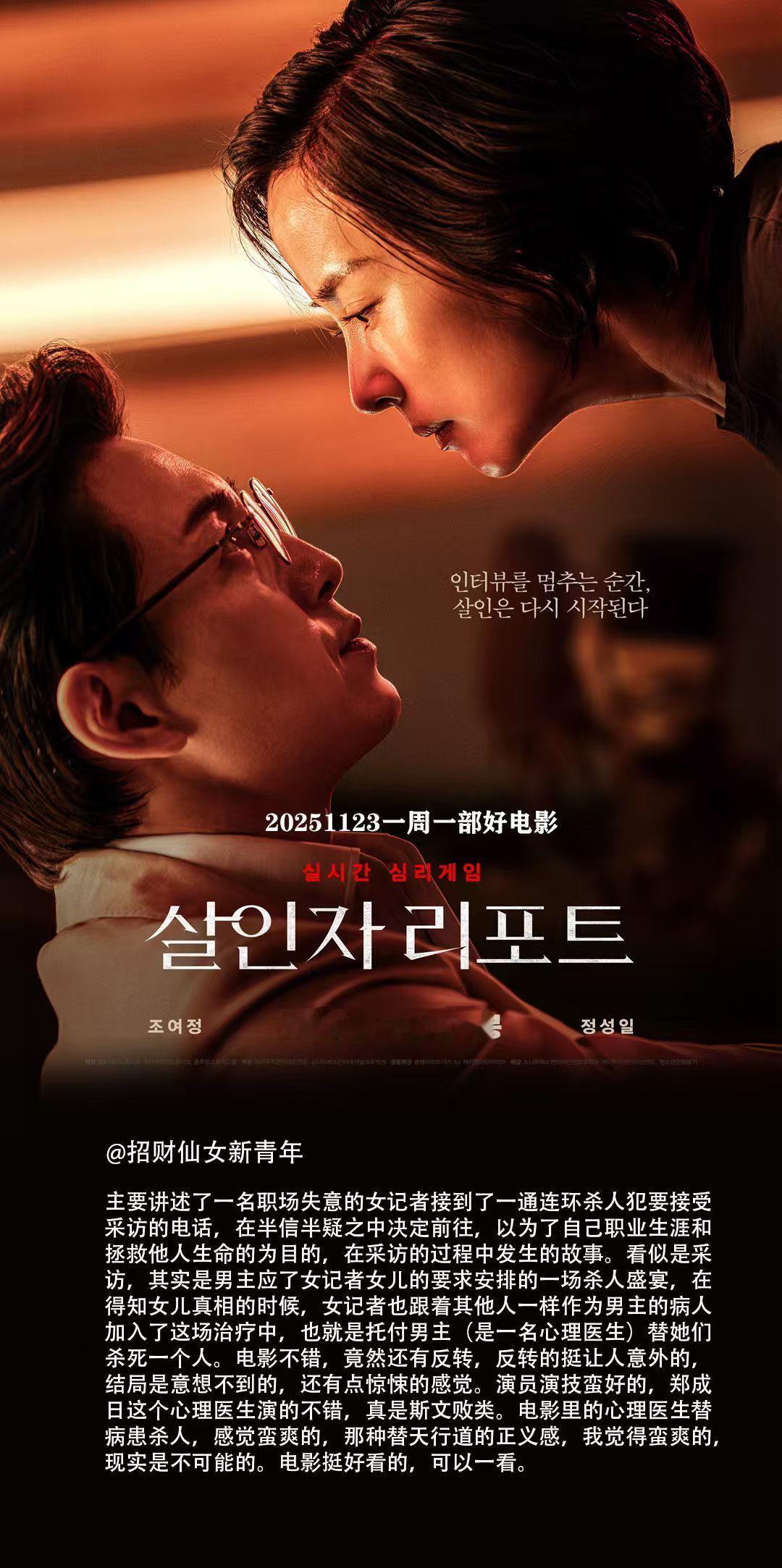韩国小成本犯罪悬疑电影《杀人者报告》,感觉豪华酒店租两个房间基本就完成整部电影的取景拍摄。虽说制作规模不大,但整部电影推进节奏铺陈的不错,算得上引人入胜,反转情理之中意料之外。大众印象中医生都是悬壶济世治病救人,可这部电影却反向操作。当作为记者的女主角采访连环杀人犯时却发现,这位作为医生的杀人犯,在做着替天行道的事情。这部电影的看点主要是女记者面对杀人者的态度,从愤怒不解到最后彻底共情,毕竟到最后自己也变成了医生的患者,需要医治,需要救助。《杀人者报告》作为电影有种不够看的感觉,试想如果能制作剧集,精神科医生总会面对形形色色的患者以及给他们造成精神伤害的凶手,每次的手起刀落,既是对社会病理的诊治,更有复仇的刺激。电影娱乐性不错,推荐观看,期待真能制作剧集。