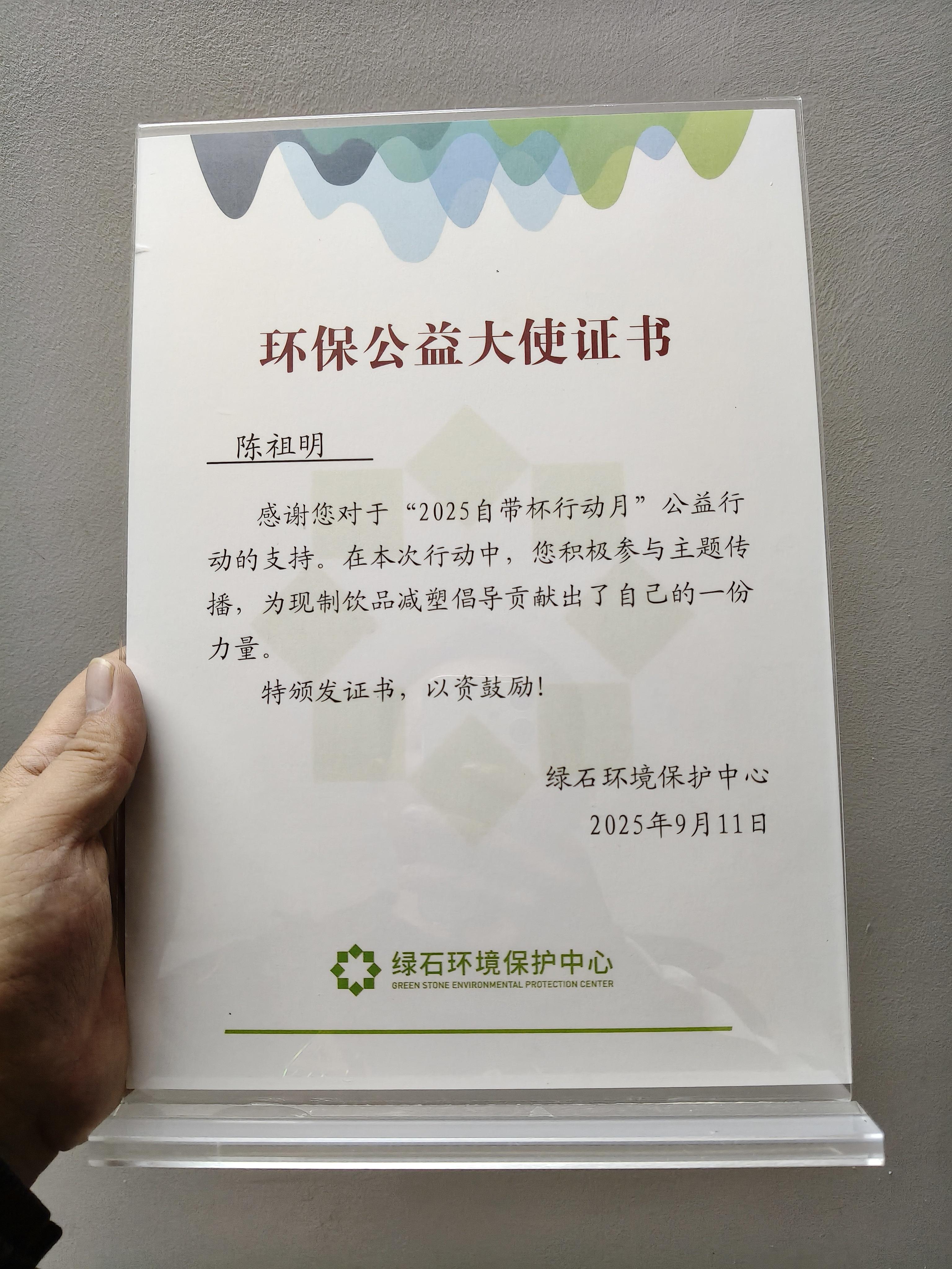 今天收到了绿石环境保护中心颁发的证书了,感谢绿石环保的肯定!未来我会继续做生活里的“减塑行动派”。