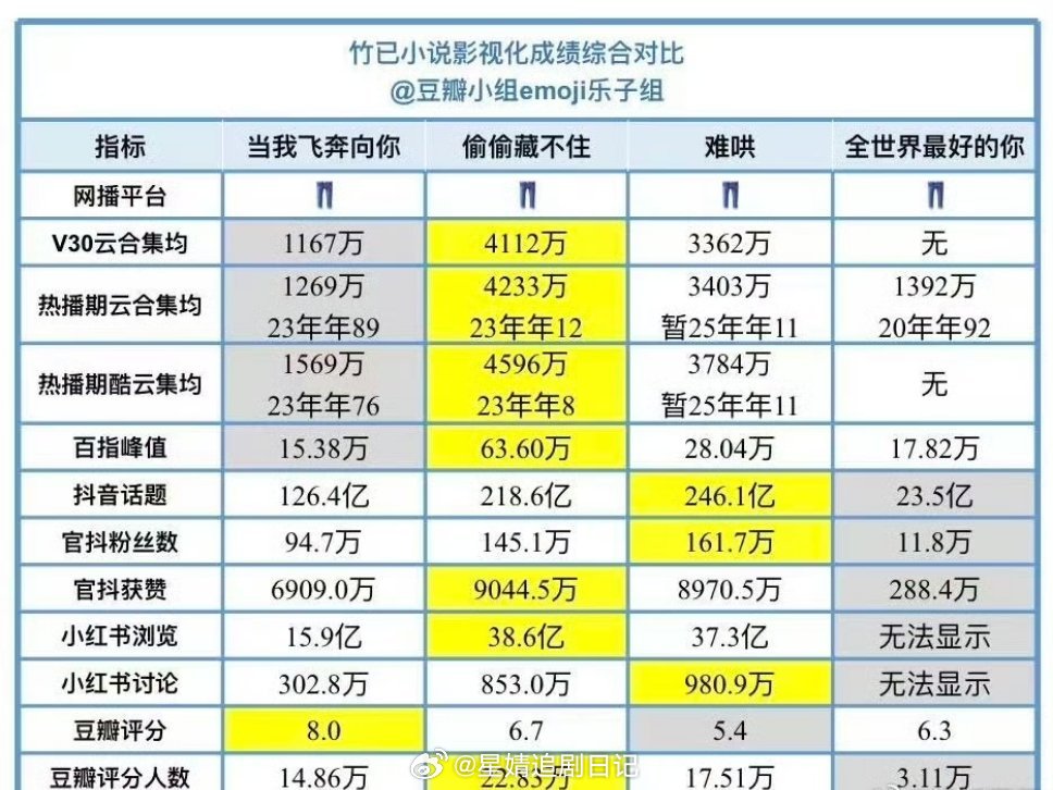 竹已小说影视化成绩综合对比:当我飞奔向你、偷偷藏不住、难哄、全世界最好的你