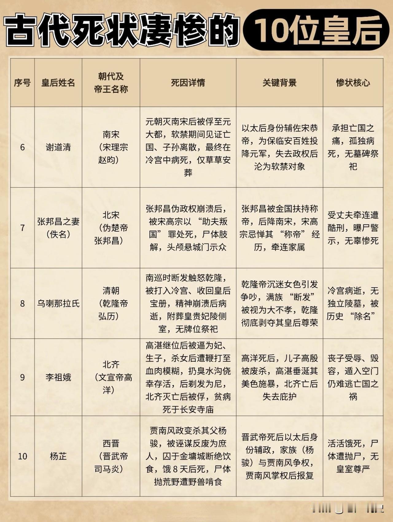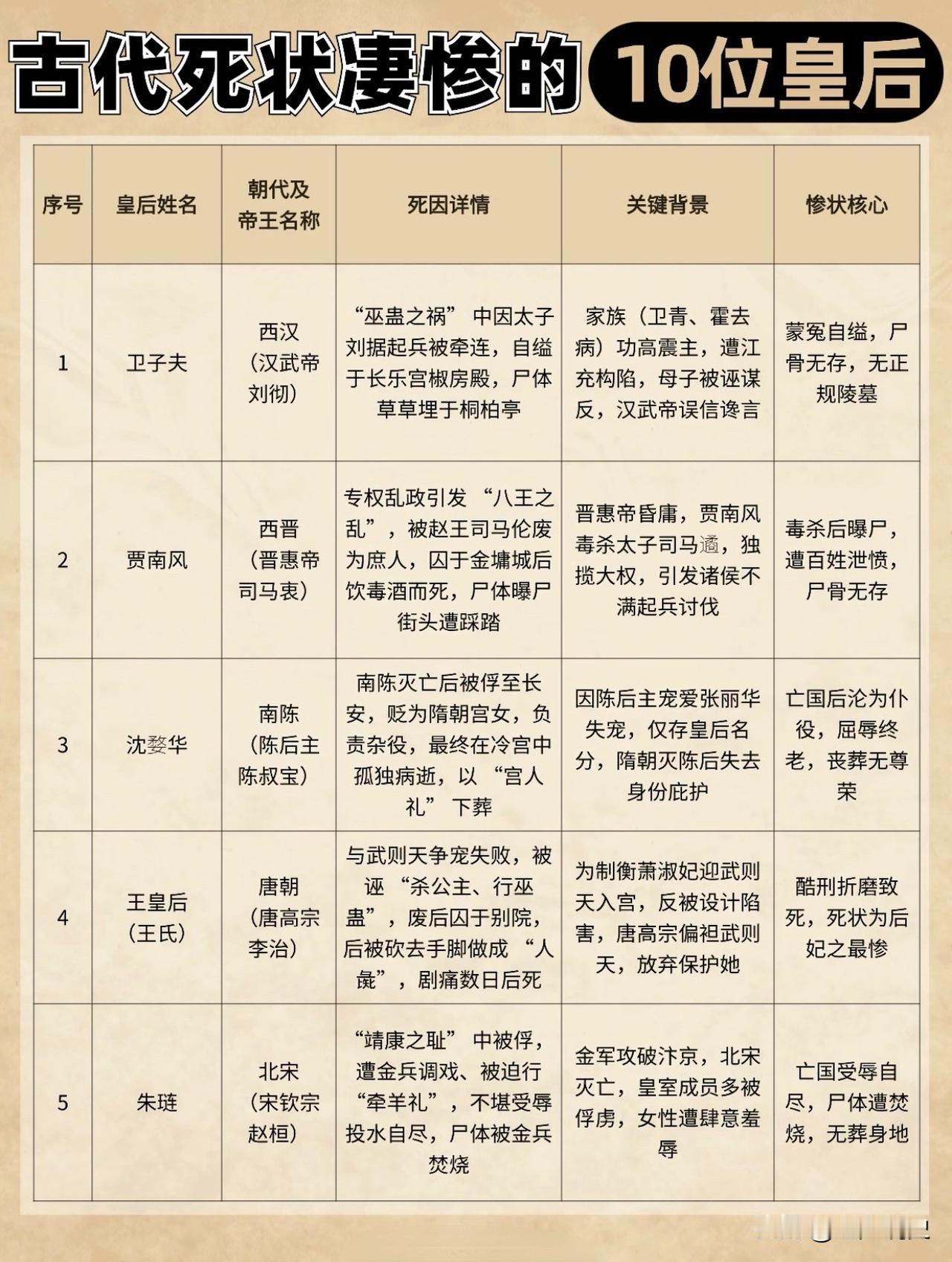 我国古代死状凄惨的10位皇后,你知道几位,谁最死有余辜? 这10人中,贾南风、王皇后、张邦昌之妻、李祖娥及杨芷结局最凄惨,其中,又以贾南风历史名声最差,死不足惜,至于卫子夫则是死得最冤枉的。 历史人物