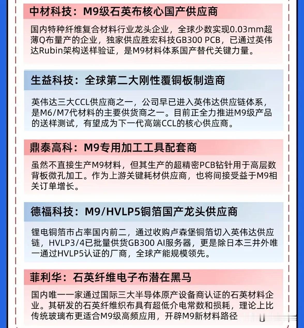 英伟达M9材料引领AI算力新突破,国产供应链迎发展机遇 近日,英伟达确认采用M9级覆铜板材料,这一高性能基材成为下一代AI芯片实现超高数据传输的关键。随着AI算力需求持续升级,M9材料所涉及的覆铜板、树脂、玻璃纤维及加工工具等环节均迎来新的市场机遇,产业链关注度显著提升。 在细分领域,碳氢树脂作为M9覆铜板的核心介质,国内已有企业实现技术突破,成为全球少数可提供替代方案的供应商。电子级环氧树脂厂商积极布局前驱体材料,凭借一体化生产能力向高端领域延伸。高端电子布制造商凭借极薄、低介电损耗产品,在M9材料增强层应用中占据重要地位。此外,石英纤维布凭借其超低介电特性,为M9体系提供了新的材料路径,展现出潜在发展空间。在配套环节,精密加工工具与高性能铜箔等企业也因M9需求增长而间接受益。 从市场情绪看,M9材料相关概念近期热度较高,反映出市场对AI算力基础设施升级的强烈预期。在国产化替代趋势下,相关产业链未来发展潜力较大,中高端材料与技术布局的企业有望持续受益。未来,随着AI芯片迭代与技术验证推进,M9相关环节可能迎来订单与业绩的逐步释放,但需关注技术进展与市场需求的实际匹配情况。整体来看,该领域处于成长初期,具备长期跟踪价值。 英伟达芯片 英伟达芯片出口 英伟达技术 英伟达发展 英伟达AI 英伟达营收 科技英伟达 英伟达出口新规 股票财经 股市分析