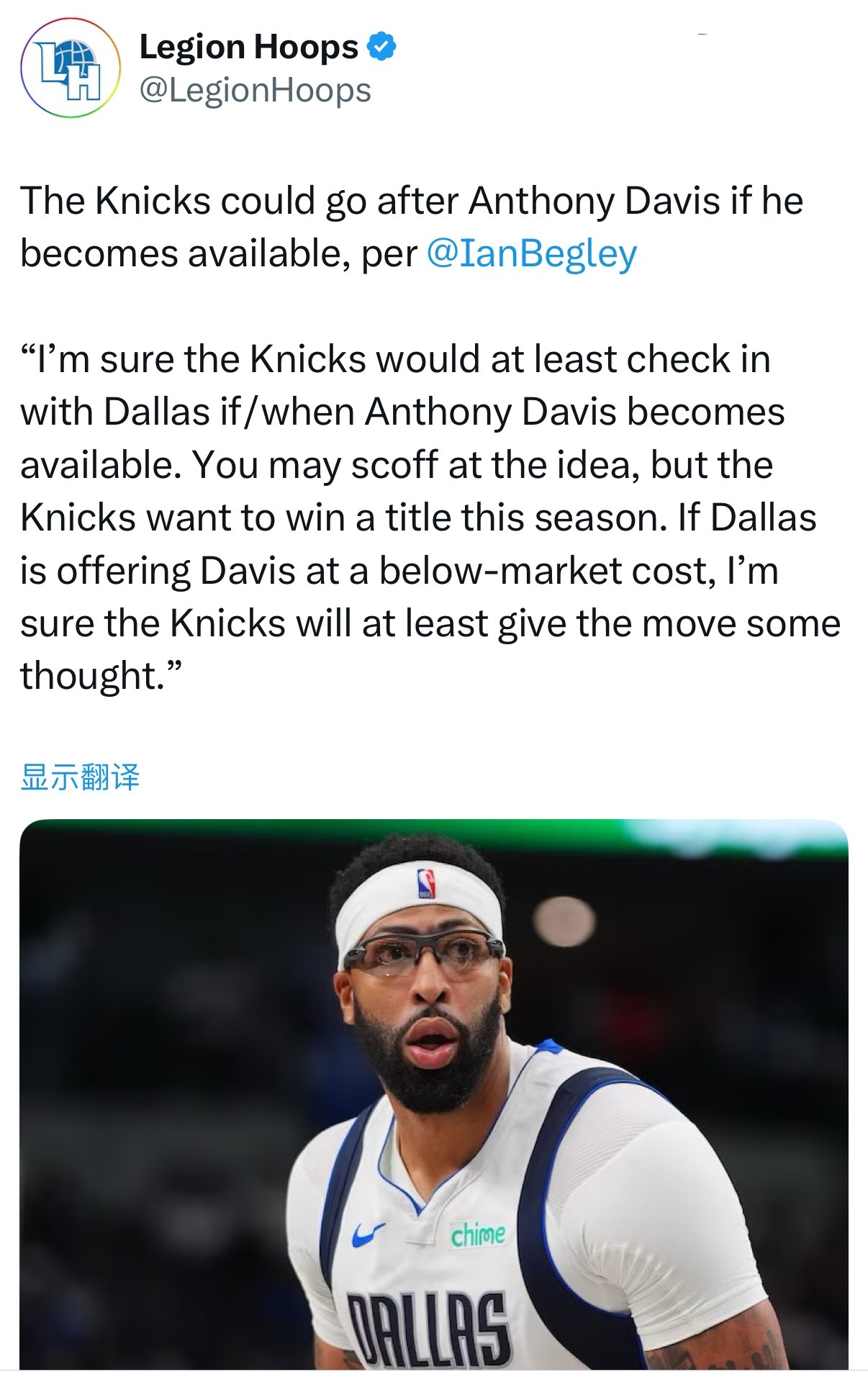 IanBegley :如果安东尼·戴维斯进入交易市场,尼克斯可能会出手追逐他。“我敢肯定,一旦安东尼·戴维斯可以被交易,尼克斯至少会去和独行侠接触。你可能会觉得这个想法有点离谱,但尼克斯本赛季就是想冲击冠军。如果独行侠愿意以低于市场价的筹码送走戴维斯,我相信尼克斯至少会认真考虑一下这笔操作。”