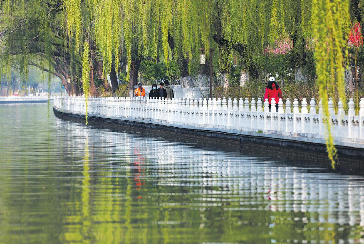 2024年4月11日,市民在南长河畔的滨水步道间游览。资料图片/新京报记者李木易摄