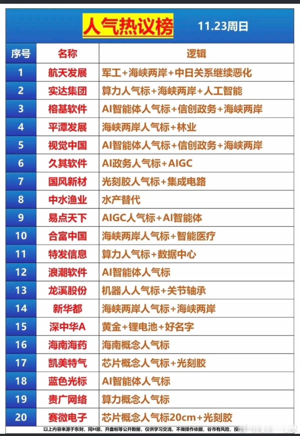 11.23周日 热门股票 周末人气榜!1.航天发展:军工+海峡两岸+反制2.实达集团:算力+海峡两岸+人工智能3.榕基软件:AI智能体+信创+海峡两岸4.平潭发展:海峡两岸人气标+林业5.视觉中国:AI智能体+信创+海峡两岸6.久其软件:AI政务人气标+AIGC 7.国风新材:光刻胶人气标+集成电路8.中水渔业:水产替代9.易点天下:AIGC人气标+AI智能体10.合富中国:海峡两岸人气标+智能医疗