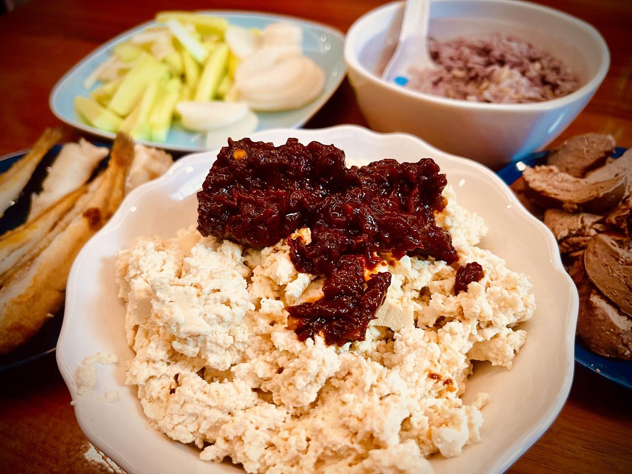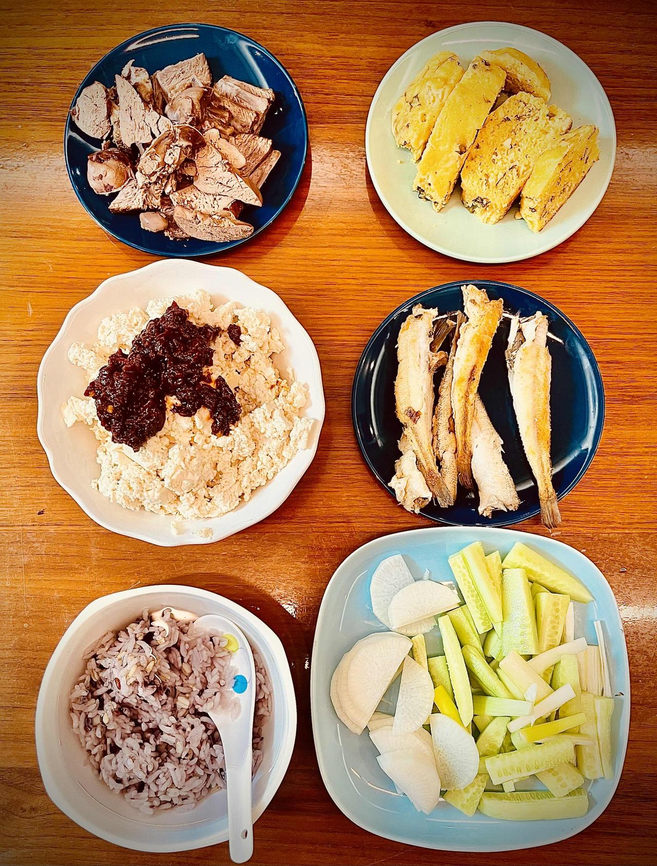 茶泡饭,贴饼子, 煎小鱼,拌豆腐, 多吃蔬菜卤肉肉。