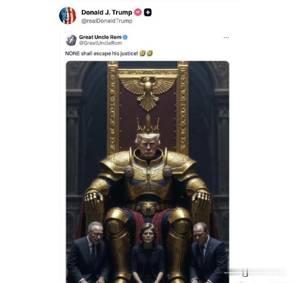 特朗普发布了一张“特朗普国王”的照片,照片中查克·舒默和其他民主党人跪在地上。 海外新鲜事热点现场