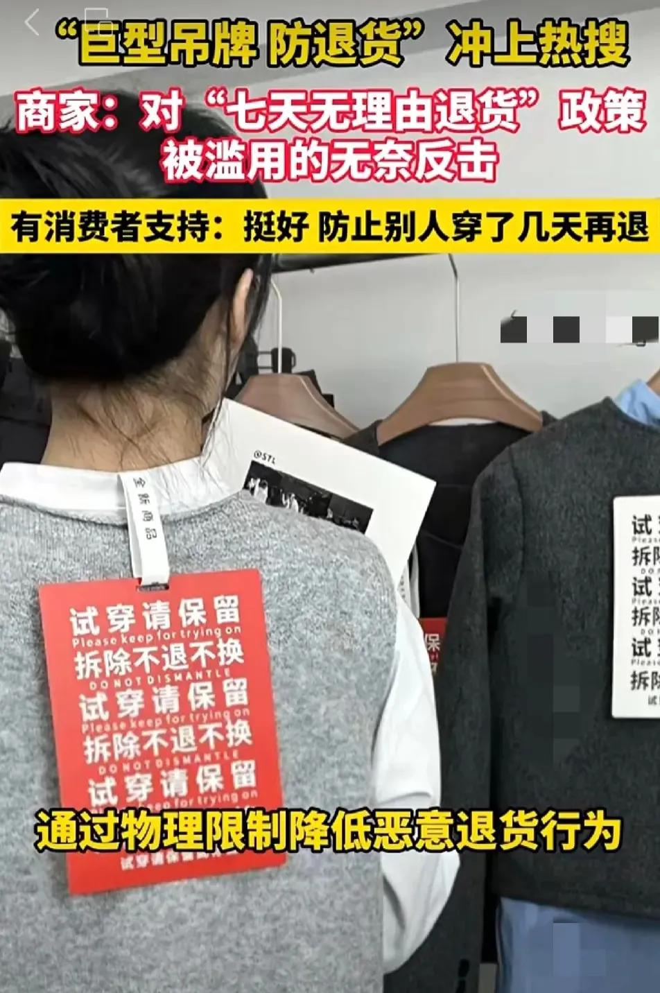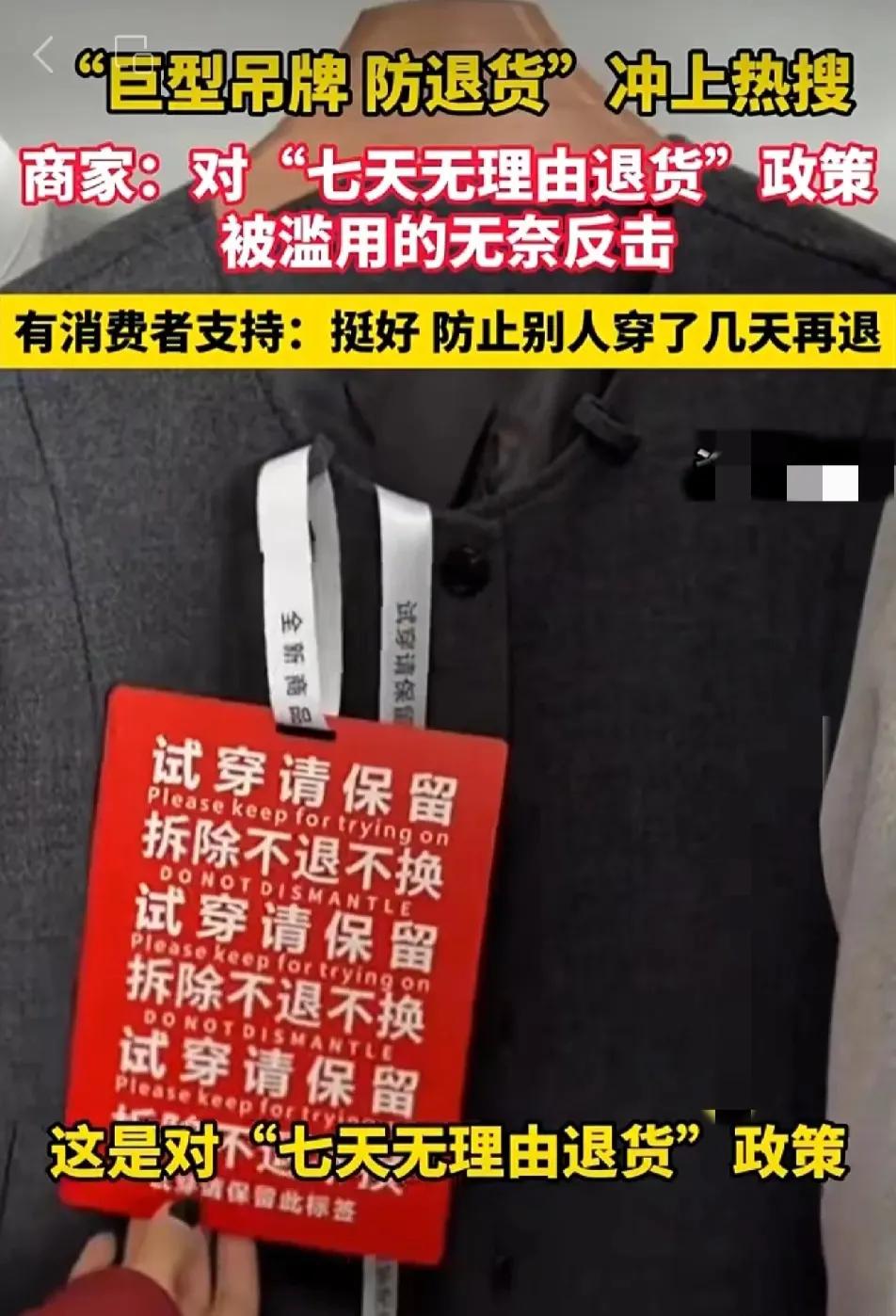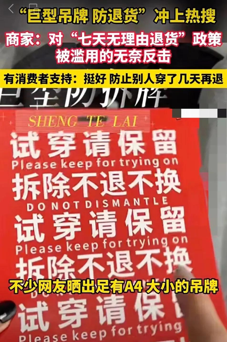 白嫖党的好日子到头了! 巨型吊牌推出了,这是网店服装卖家,为了防止一些人白嫖“蹭穿”。商家讲述背后无奈……莫让“无理由”成“无理”,“7天无理由退货”规则不该被滥用! 最近刷到不少网店晒出的巨型吊牌,那尺寸看得人都愣了——有的比巴掌大两倍,有的直接做成明信片大小,上面还印着“拆吊牌后不支持退货”的醒目字样。有商家吐槽,以前没这么夸张,直到遇到太多“奇葩”买家,才不得不出此下策。 有个卖连衣裙的店主说,之前有个客户一次买了三条不同款式的裙子,备注“着急穿,麻烦尽快发货”。结果收到货第三天就申请全退,客服拆开退回的包裹一看,其中一条裙子的裙摆有明显的褶皱,领口还沾着点口红印,明显是穿过的。联系买家对质,对方还理直气壮:“7天无理由退货,我穿一次怎么了?又没坏!”气得店主半天说不出话。 还有更过分的,有人买了礼服裙,退回来的时候裙摆还沾着晚会场地的亮片;有人买了牛仔裤,裤脚磨得毛边都翻起来了,却说“不合身就退,这不是规则允许的吗?”这些买家把“7天无理由”当成了“免费试穿券”,穿完重要场合、拍完照片就退货,留下一堆被“蹭穿”过的衣服,商家要么只能低价处理,要么就得承担亏损。 其实“7天无理由退货”当初出台,是为了保护消费者权益,毕竟网购看不到实物,难免有不合身、不满意的时候。可现在倒好,成了部分人“白嫖”的工具。商家推出巨型吊牌,也不是真想为难正经买家,只是想通过这种显眼的方式提醒——吊牌拆了就代表使用过,再退货就不合规矩了。 说真的,做生意都不容易,尤其是小网店,本来利润就薄,经不住这么折腾。消费者维权是应该的,但也得讲良心,不能把规则当成自己占便宜的借口。要是大家都这么滥用“无理由退货”,最后受伤的还是整个网购环境——商家可能会提高价格来对冲风险,或者干脆不再支持无理由退货,正经买家反而没了保障。 各位读者你们怎么看?欢迎在评论区讨论。