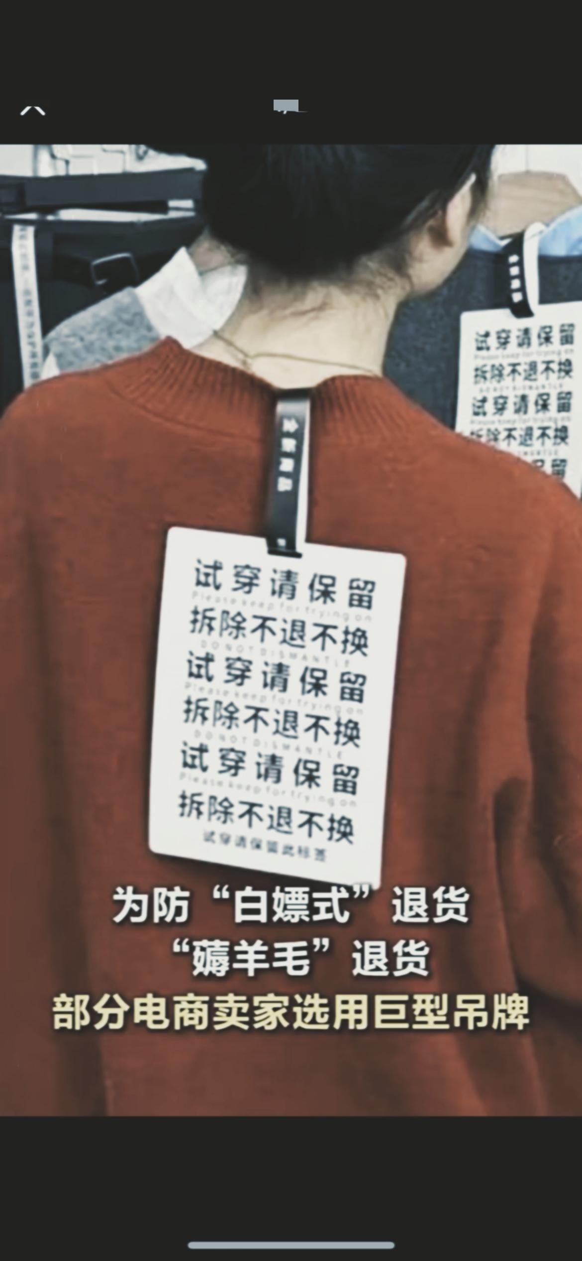 一觉醒来,电商白嫖党集体破防! 巨型吊牌横空出世,央视力挺+全网叫好,这下终于治住歪风! 电商卖家的苦,真不是常人能懂——白嫖党吃透平台规则,衣服穿个三四天、拍组穿搭照就退货,退回的衣服没法二次销售,商家只能默默吃哑巴亏。 这哪是购物,分明是免费“蹭穿”! 巨型吊牌看似简单,实则戳中要害:只要拆了吊牌就没法退货,直接断了白嫖党“穿完就退”的念想。 央视点赞、网友力挺,说明公道自在人心——尊重是相互的,卖家凭本事赚钱,凭啥要为投机取巧买单? 别拿“规则漏洞”当理所当然,商业的底线是诚信。 这下白嫖党没了免费衣服穿,你觉得这波操作能彻底根治“蹭穿”乱象吗?来评论区聊聊~