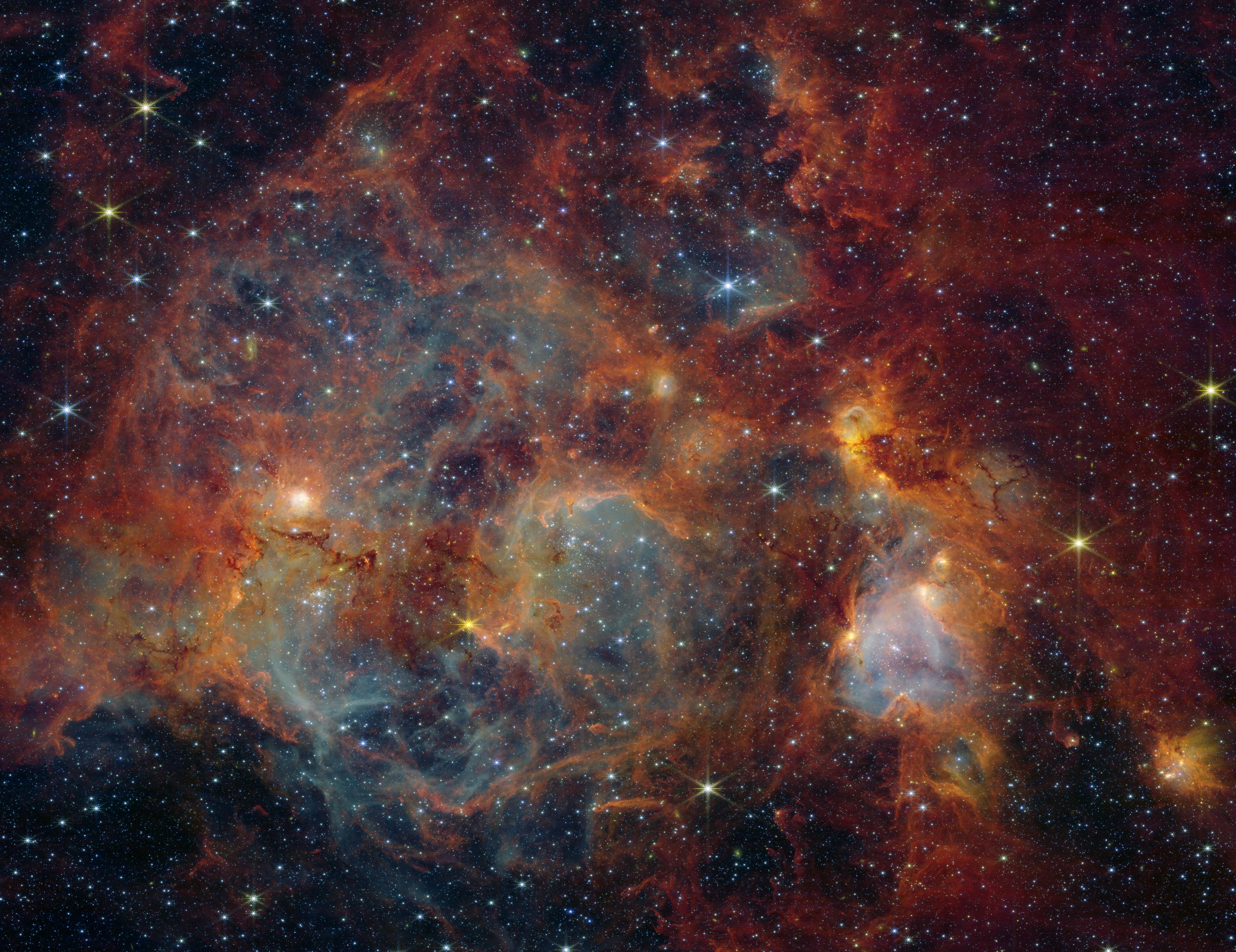 韦布望远镜生图流出~~这是16万光年以外大麦哲伦云中一处名为LHA 120-N 159(简称N159)的区域,由韦布望远镜的近红外相机拍摄。之前,哈勃望远镜也看过 N159。但哈勃主要看的是可见光。在宇宙中,新诞生的恒星往往裹着厚厚的尘埃襁褓,这些尘埃会阻挡可见光,就像浓烟挡住了视线。所以,我们以前看到的 N159,大部分细节都被黑乎乎的尘埃遮住了。但韦布望远镜不同。它看的是红外线。红外线的波长比可见光长,有一种独特的“穿墙术”,能轻而易举地穿透尘埃云。于是,在韦布的最新图像中,那些原本不仅阻挡视线、还显得死气沉沉的暗黑尘埃,突然变得通透、明亮,甚至还在发光。~~~~风暴中的蝴蝶通过韦布的视角,我们看到了一个极其混乱却又壮丽的场景。首先映入眼帘的,是错综复杂的气体纤维,它们像人体内的血管脉络一样交织在一起。这些并不是随意飘散的烟雾,而是被巨大的力量“雕刻”出来的。在 N159 内部,诞生了一批非常年轻、质量巨大的恒星。这些“新生儿”并不乖巧,它们也是暴脾气,向外喷射出强烈的星风(带电粒子流)和辐射。这些力量就像无形的推土机,硬生生地把周围的气体推开,吹出了一个个巨大的空洞和气泡。在图像的色彩处理上,你会看到大片橙红色和蓝色的交融。这不是随意涂抹的颜料,而是温度的地图:蓝色的区域通常代表着那些极其炽热、大质量的恒星正在疯狂燃烧,而橙红色的丝缕则是被加热的尘埃和气体——那是制造下一代恒星的原材料。~~~~混乱即是生机看着 N159 的图像,你可能会觉得它像是一场灾难现场:气体被撕裂,物质被吹飞,到处是高能辐射的轰炸。但天文学家看到的却是生机。大麦哲伦云的环境很特殊,它的金属含量(天文学上把比氦重的元素都叫金属)比我们银河系低。这种环境,其实非常像早期宇宙的样子。观测 N159,就像是在翻看一本关于宇宙童年的相册。我们得以亲眼目睹,在那个物质还不够“丰富”的年代,恒星是如何在剧烈的动荡中诞生的。那些狂暴的恒星风,既是在破坏,也是在建设。它们推开气体,压缩周围的云团,这种压缩又会诱发新的引力坍缩,从而催生出下一批恒星。这就是宇宙的法则:毁灭与创造往往同时发生。~~~~~~图源: NASA, ESA, CSA, STScI;后期:reddit用户ahajesam