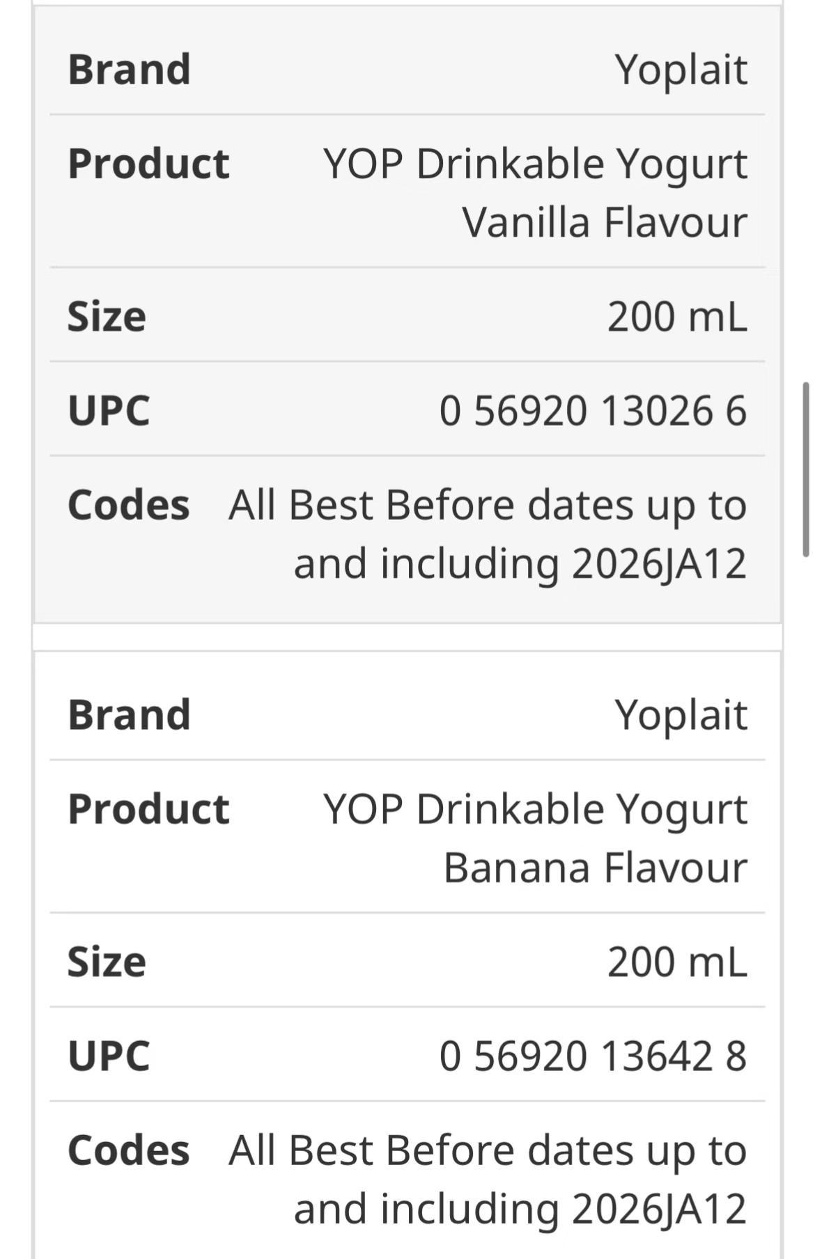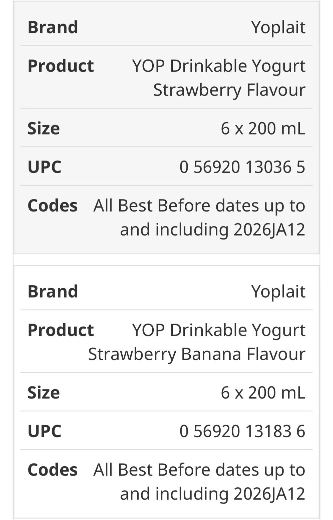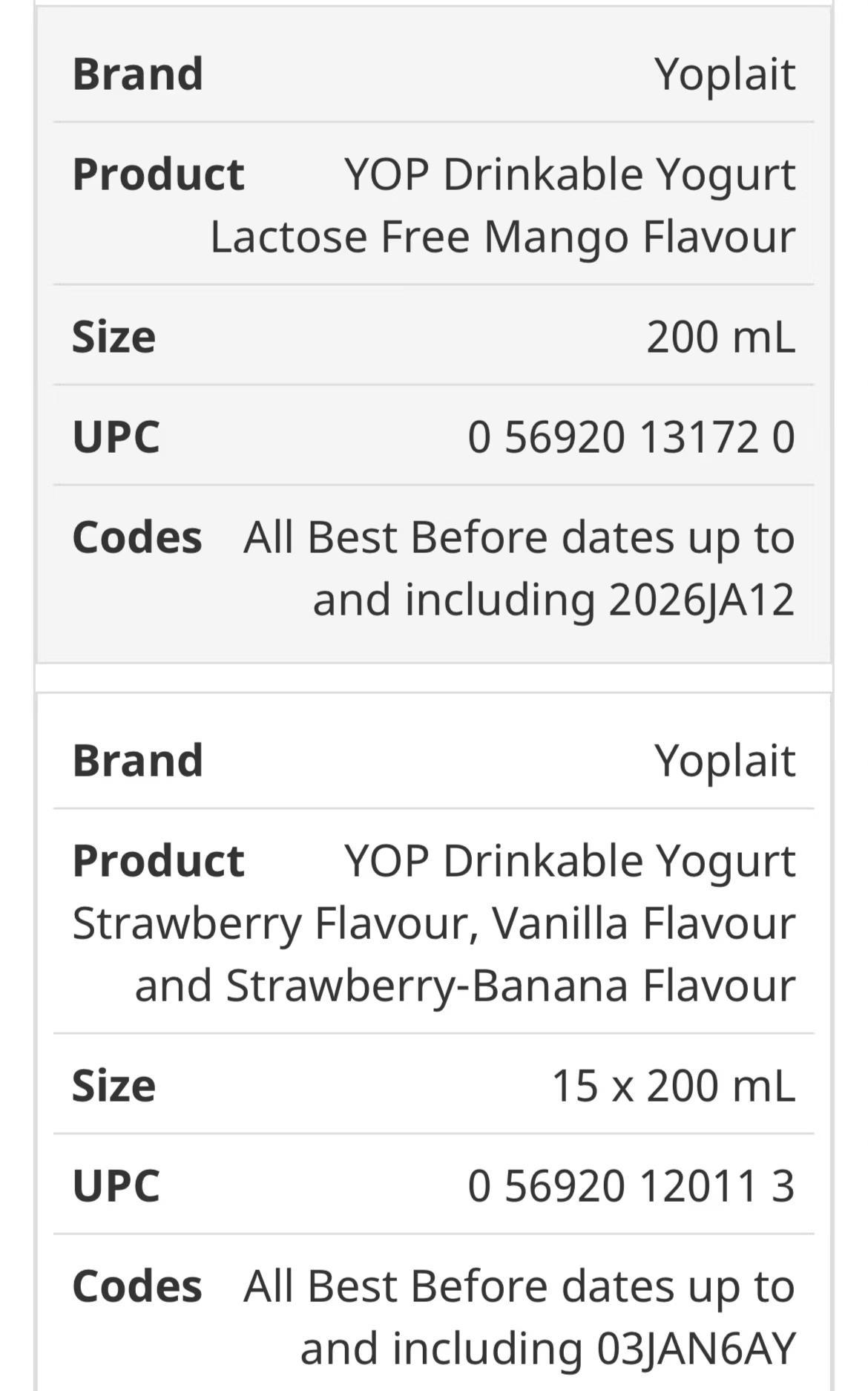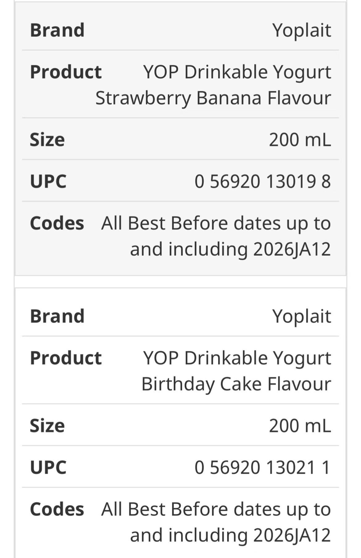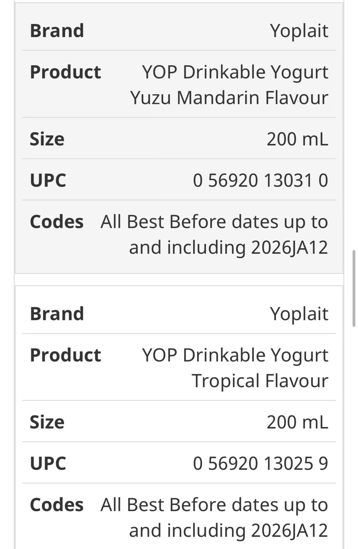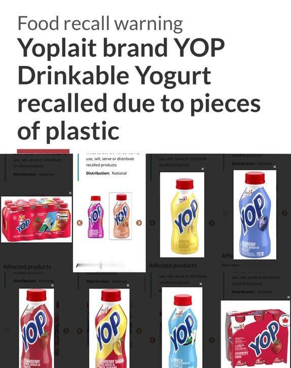 🇨🇦全国召回Yoplait瓶酸奶!可能有塑料碎片 🇨🇦new recall🔥召回一批家庭常购买的 Yoplait drinkable酸奶 200ml,包含多种口味,单瓶、6瓶装、15瓶一箱,12瓶一箱的… 原因是:可能含有塑料碎片 具体可以对下upc号码、过期日 加拿大情报小站 酸奶 加拿大情报小站 加拿大食品召回