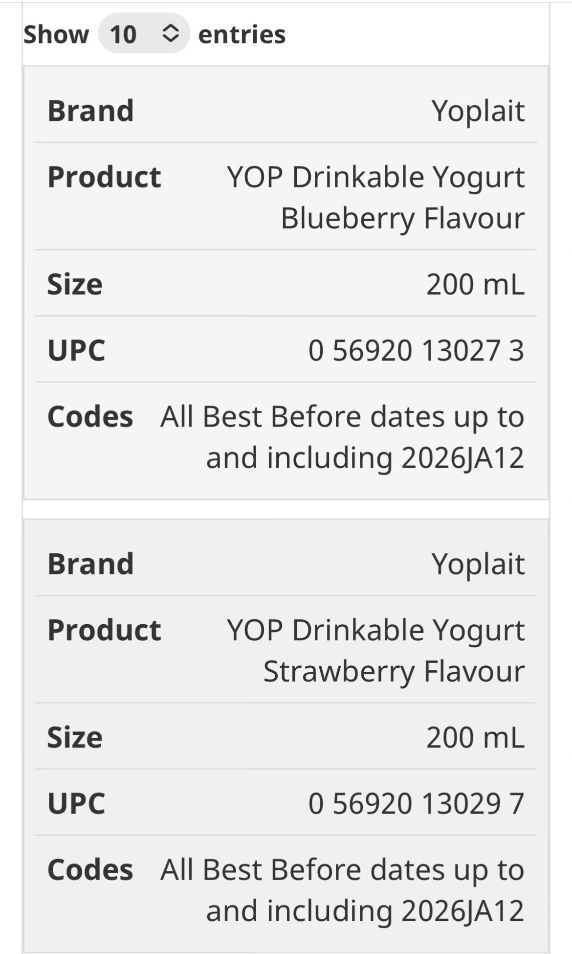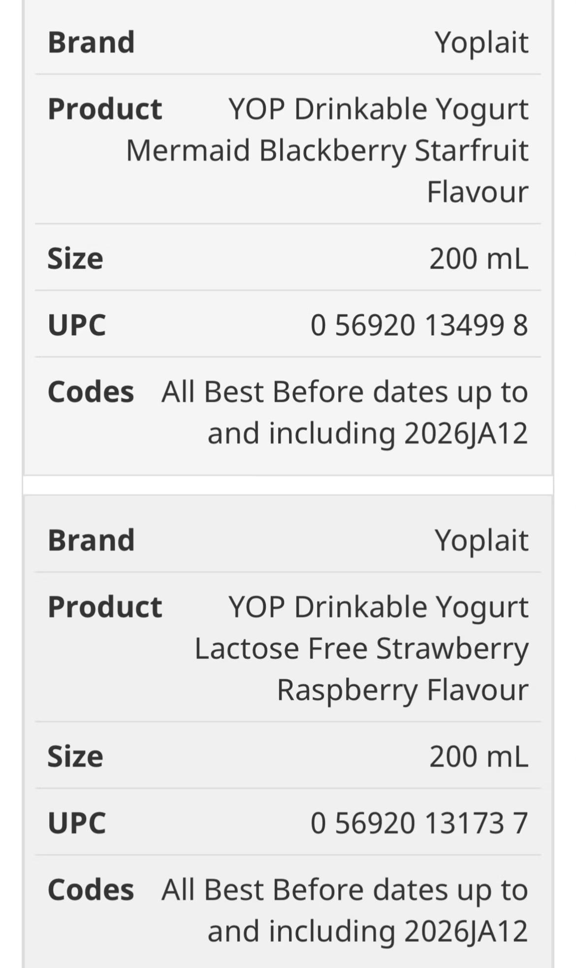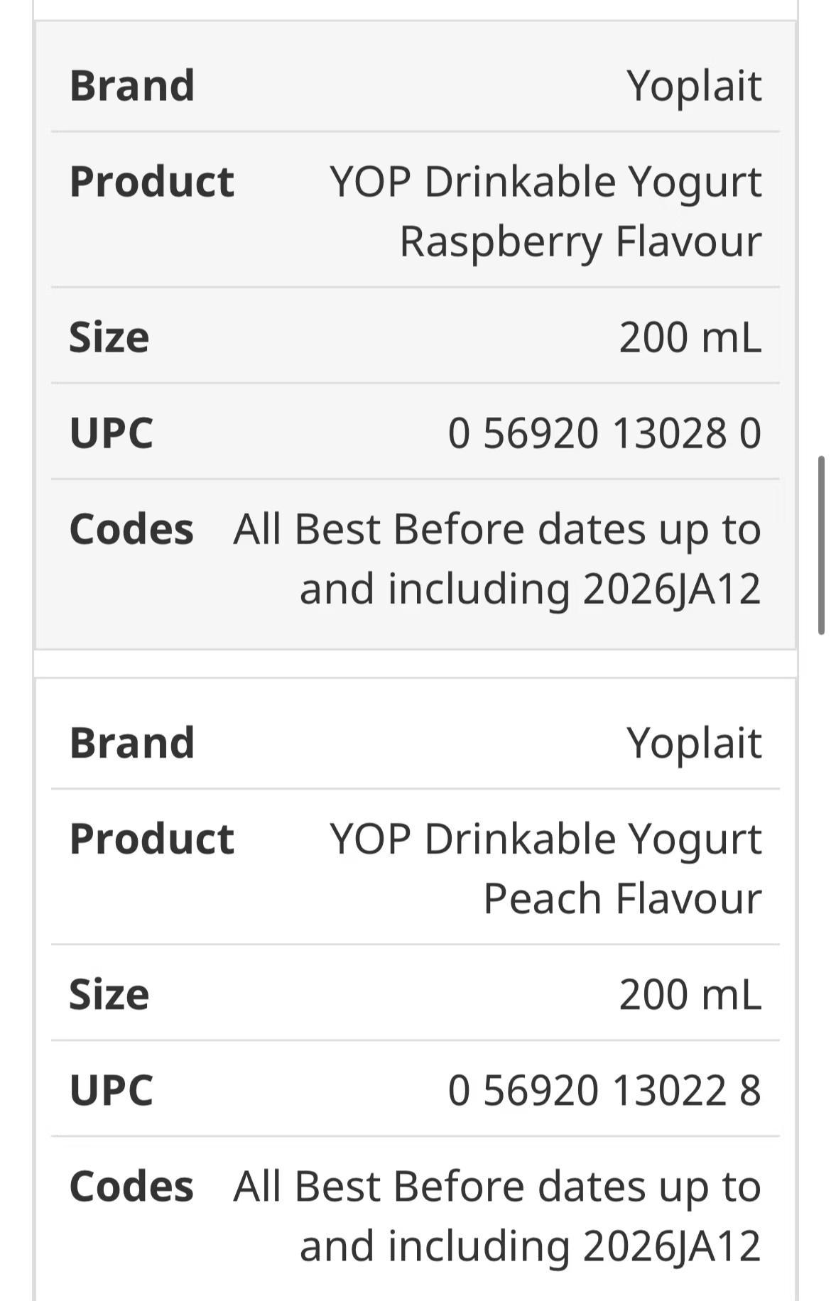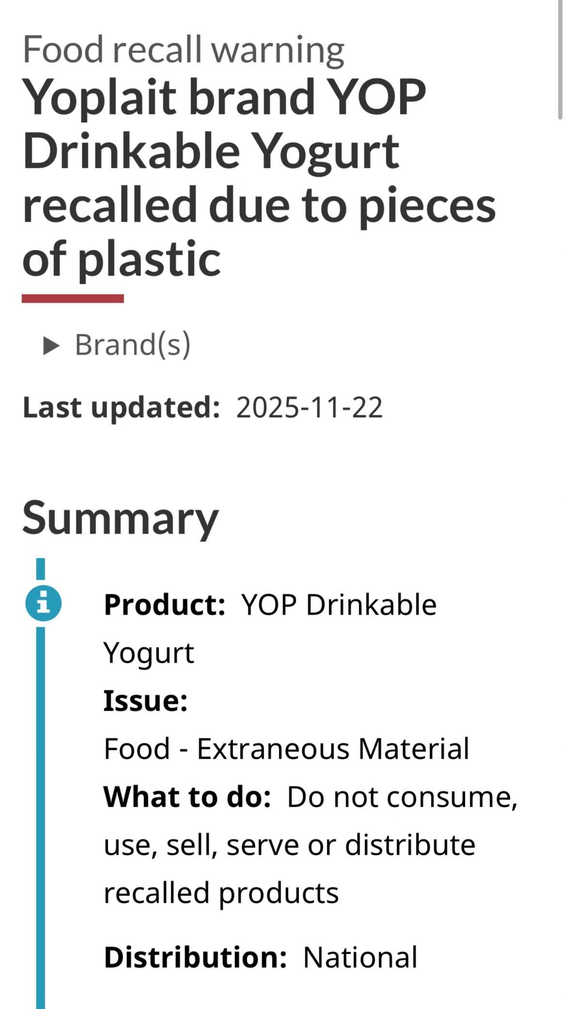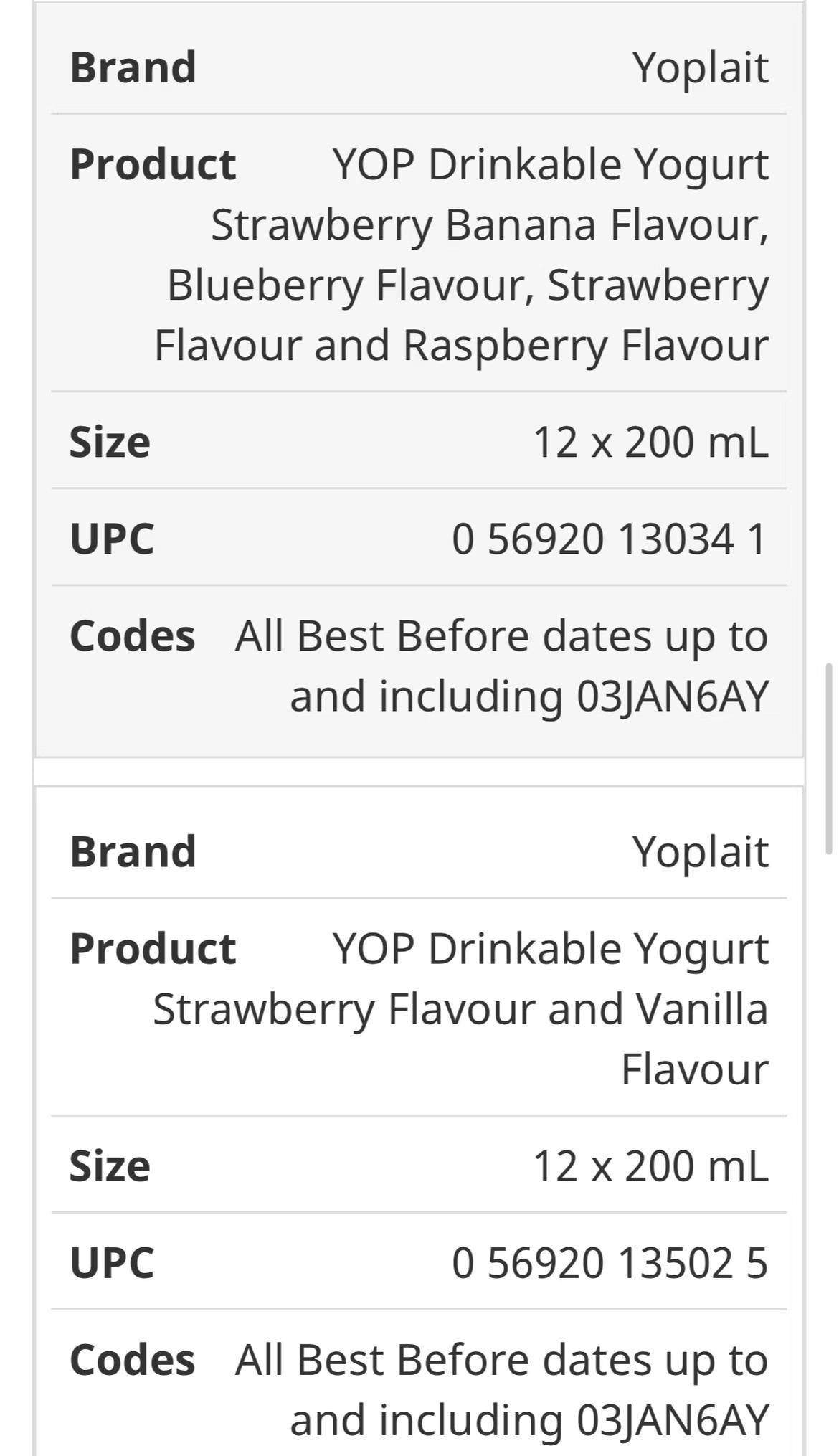 🇨🇦全国召回Yoplait瓶酸奶!可能有塑料碎片 🇨🇦new recall🔥召回一批家庭常购买的 Yoplait drinkable酸奶 200ml,包含多种口味,单瓶、6瓶装、15瓶一箱,12瓶一箱的… 原因是:可能含有塑料碎片 具体可以对下upc号码、过期日 加拿大情报小站 酸奶 加拿大情报小站 加拿大食品召回