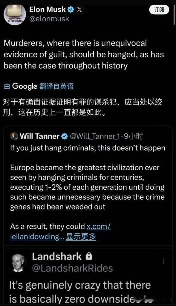 马斯克: 对于有确凿证据证明有罪的谋杀犯,应当处以绞刑,这在历史上一直都是如此。