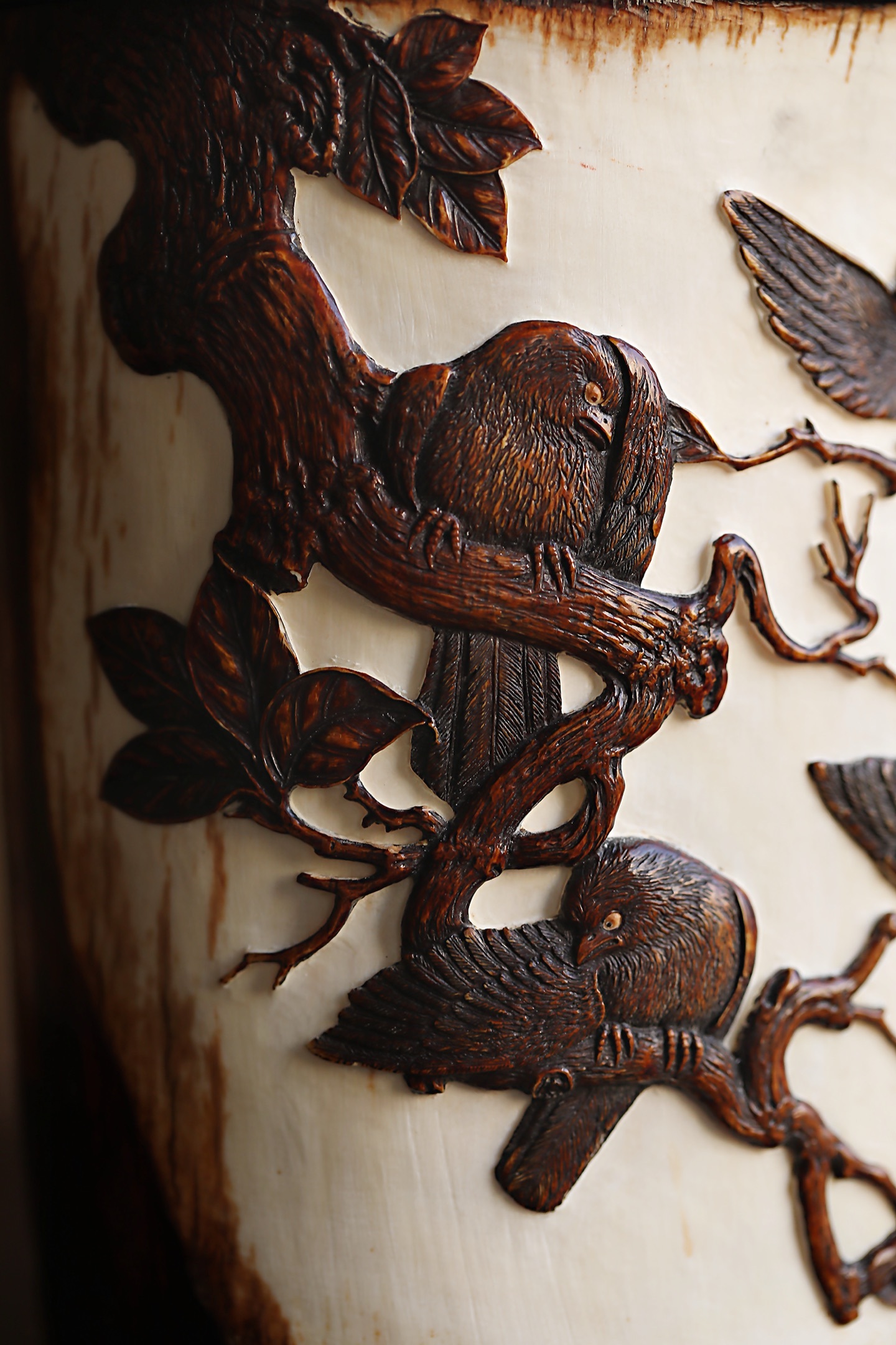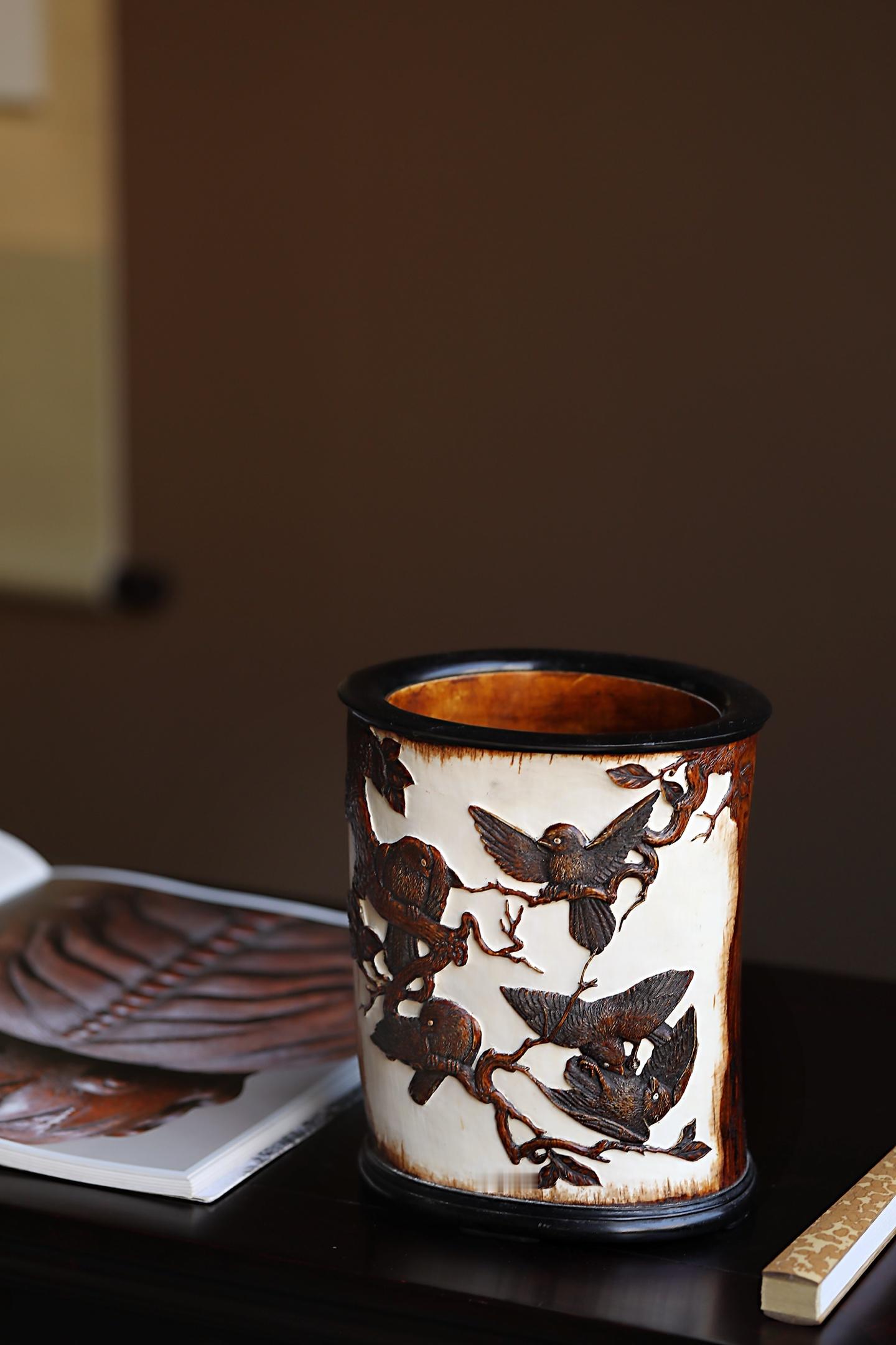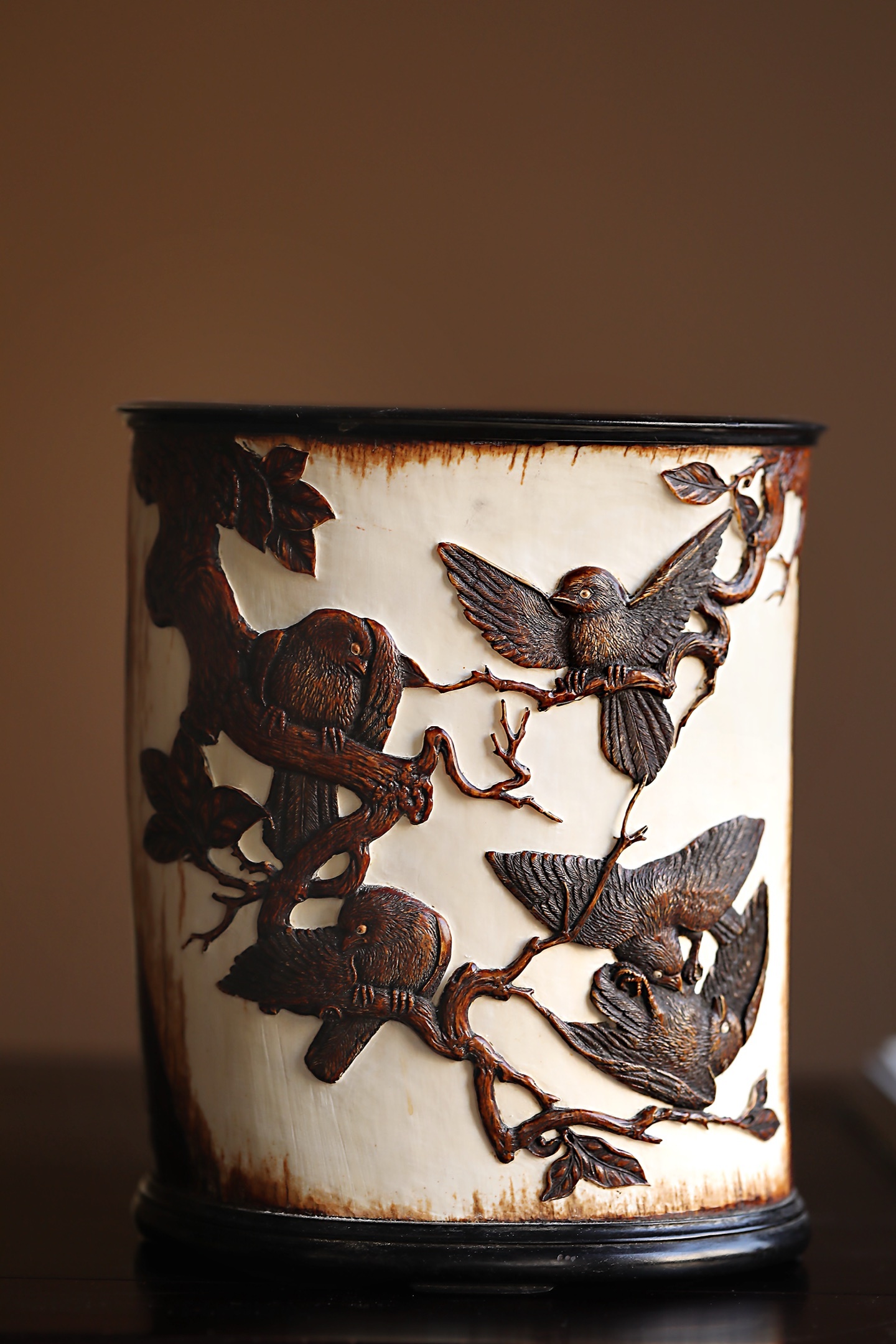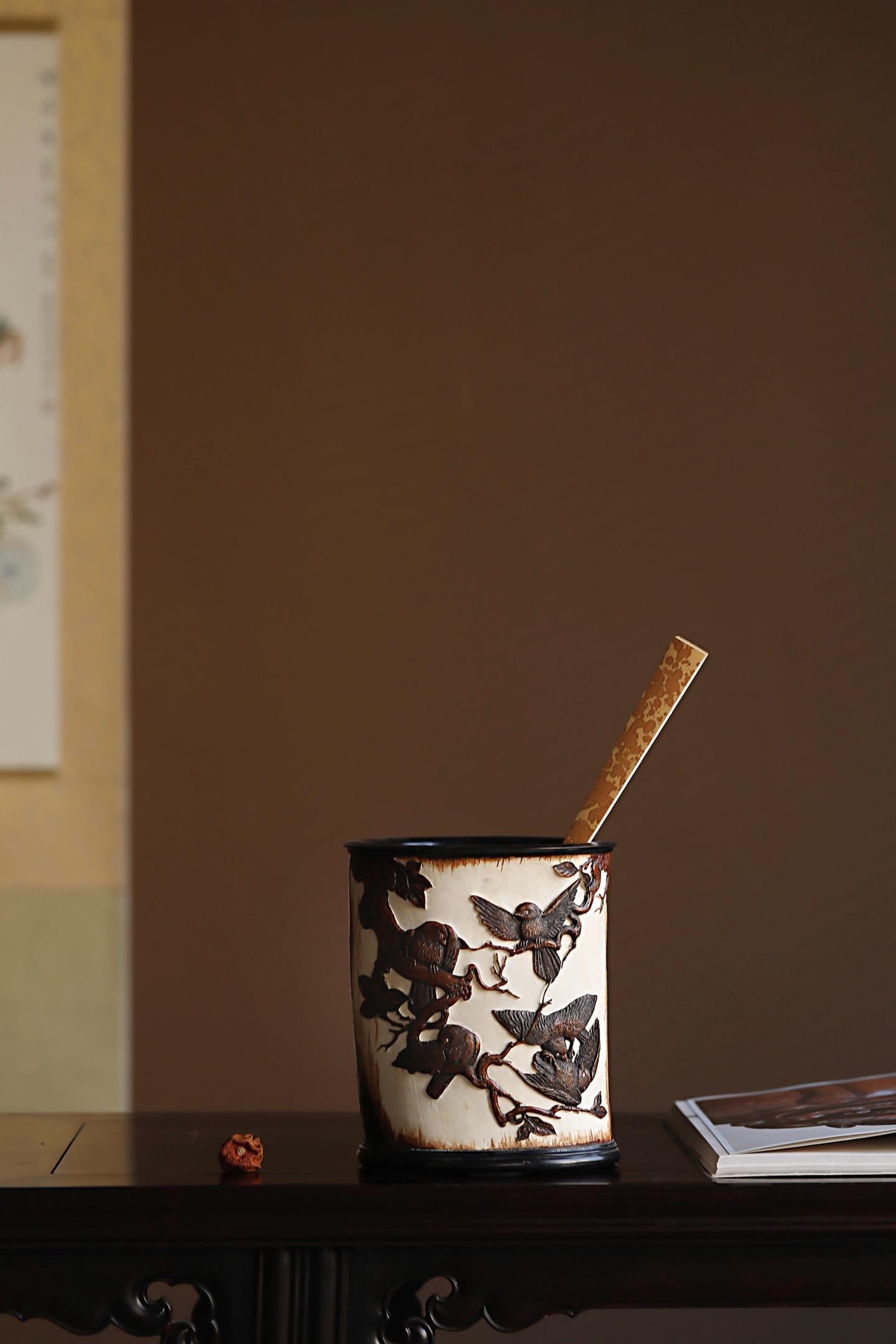 猛犸 | 寒雀图 笔筒留皮巧雕,枝干虬劲,叠压错落。立体生动,颇为清雅。刀法精湛熟练,构图疏朗有致,鸟雀刻画生动可爱。15.5*13*18cm 1595g