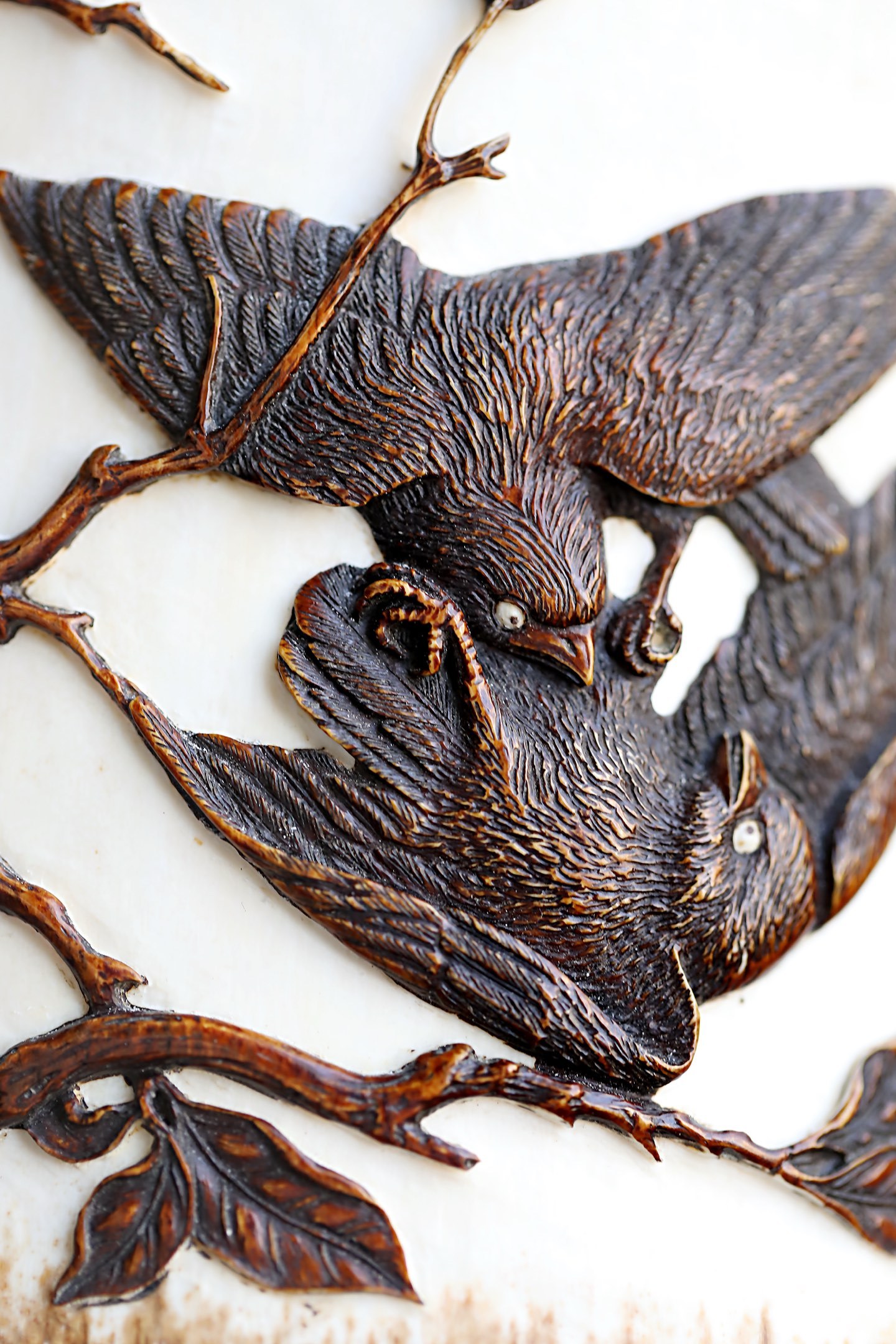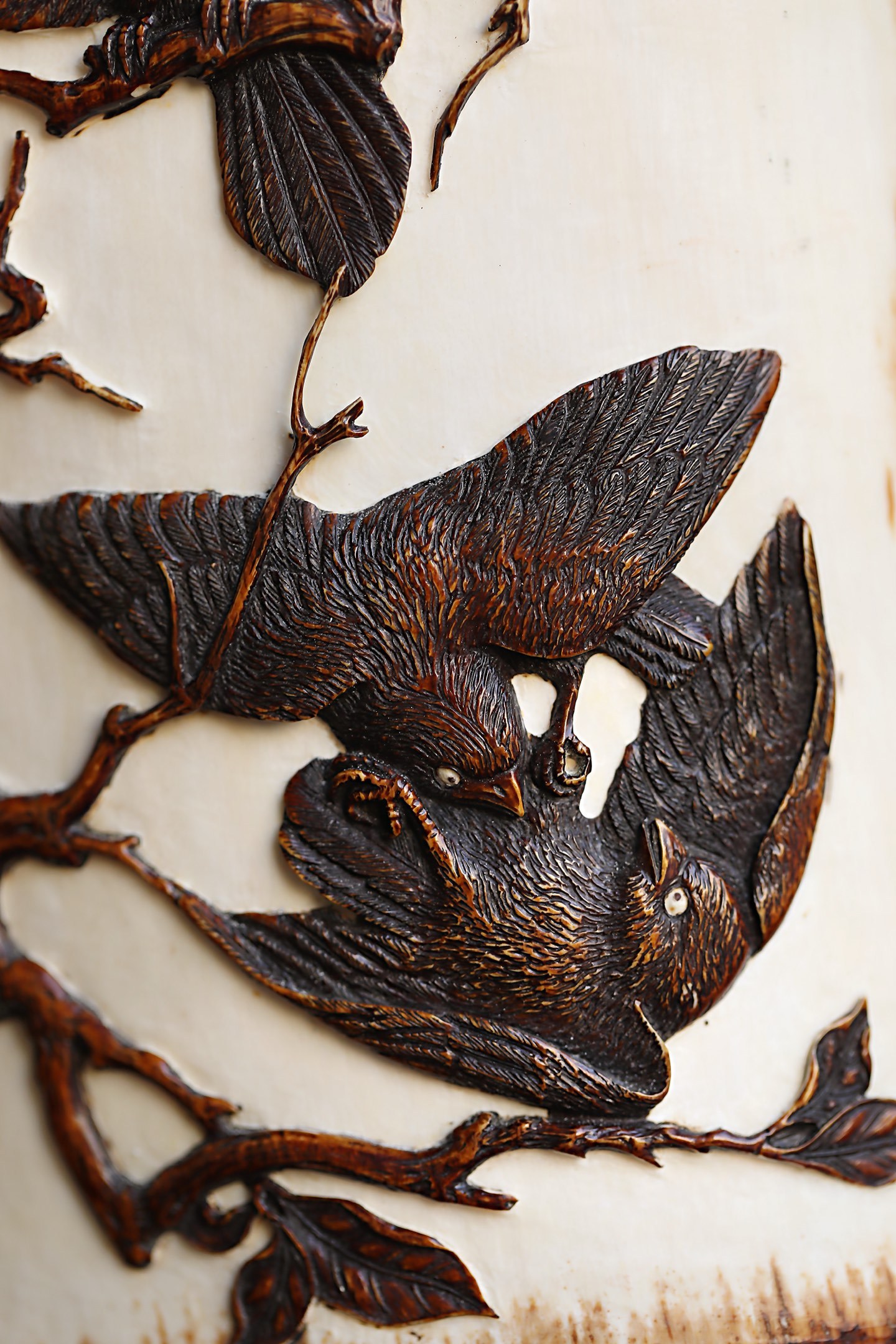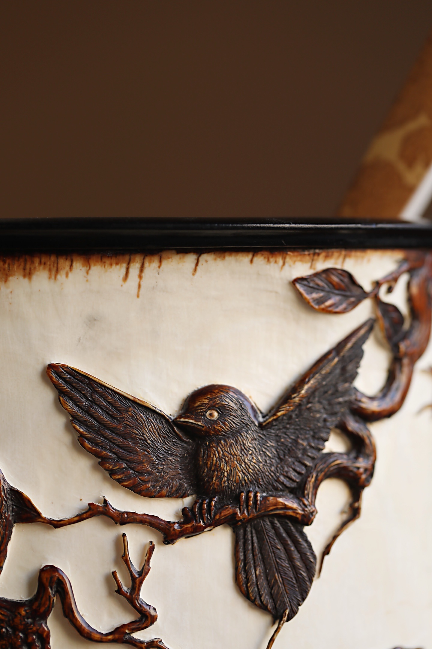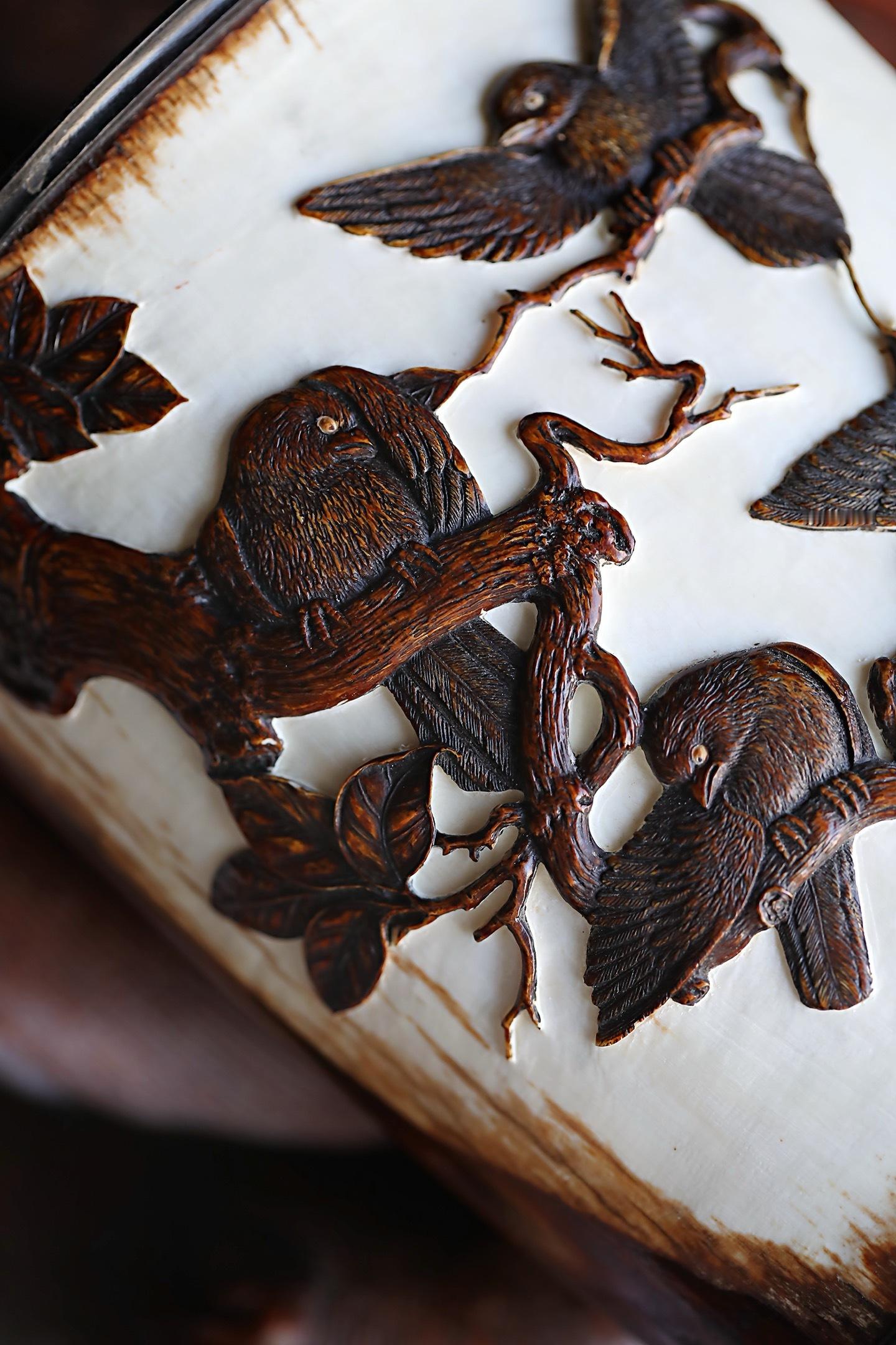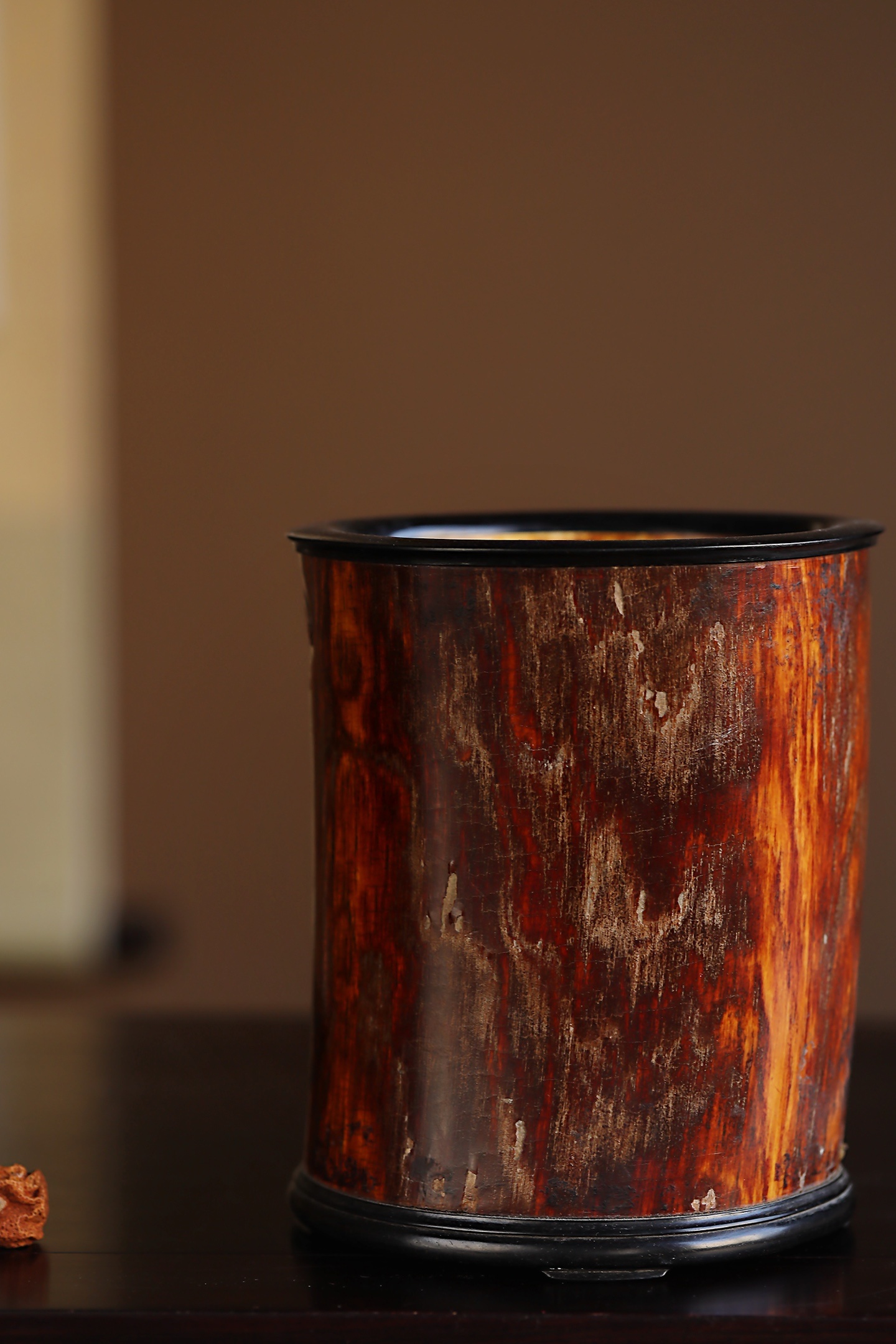 猛犸 | 寒雀图 笔筒留皮巧雕,枝干虬劲,叠压错落。立体生动,颇为清雅。刀法精湛熟练,构图疏朗有致,鸟雀刻画生动可爱。15.5*13*18cm 1595g