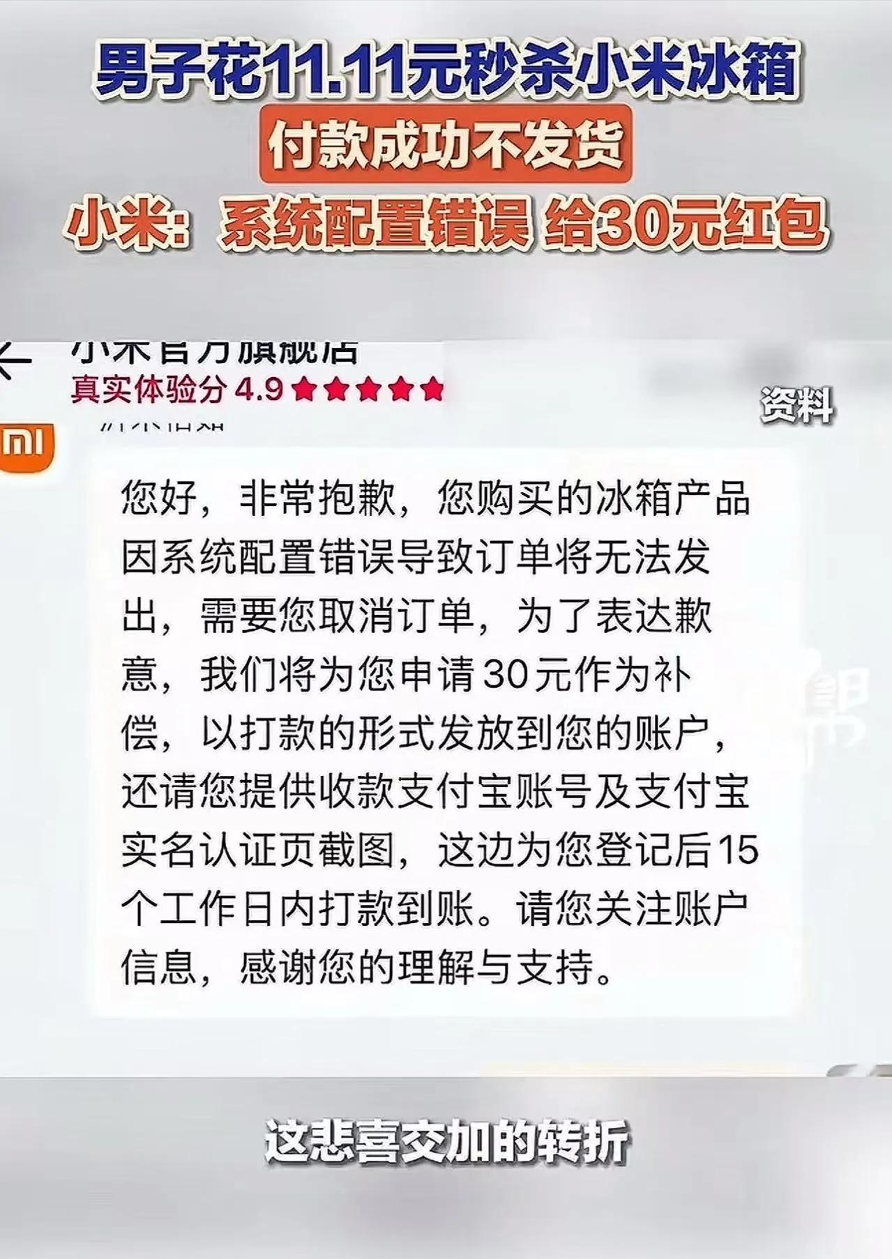 双十一当天,河南张先生花11.11元成功秒杀小米冰箱,满心期待收货时,商家却以“系统配置错误”为由拒绝发货,仅 offer 30元红包补偿。平台也和稀泥,称“商家可能选择接受处罚而非发货”。张先生愤怒维权。 一、双十一秒杀变“秒骗”?11.11元冰箱下单成功却被告知“发不了” 双十一购物节,本是消费者薅羊毛的好时机,河南的张先生却薅出了一肚子气! 当天,他在小米旗舰店刷到一款冰箱的秒杀活动,标价11.11元,比平时便宜了好几百块。张先生眼睛一亮,盯着倒计时,手指悬在支付键上,时间一到立刻下单,支付成功的提示音响起时,他兴奋得差点跳起来,赶紧截图保存订单,就等着冰箱送货上门。 可没过多久,客服发来的消息却给了他当头一棒:“亲,实在抱歉,由于系统配置错误,您的订单无法发货,建议您取消订单,我们给您补偿30元红包。” “30元?打发叫花子呢?”张先生当场就炸毛了,“我秒到的是冰箱,不是30块钱!你们活动页面明明写着‘秒杀成功即发货’,现在玩不起了?” 客服却反复强调是“价格设置失误”,还说这是平台常见问题,让张先生理解一下。但张先生不买账:“支付成功后才说错误,这不是明摆着欺诈吗?” 他不甘心,又向平台投诉,结果得到的回复更让他窝火:“经核查,商家可能确实存在价格设置错误,平台可以依据规则对商家进行处罚,但订单金额过低,商家可能会选择接受处罚而不发货。” 更讽刺的是,当张先生要求平台强制商家履约时,客服却建议他“接受补偿,避免耗时耗力”。这种“和稀泥”的态度,让张先生彻底寒心:“合着消费者权益保护法在你们这儿就是张废纸?” 二、法律解读:商家“系统错误”不是免责金牌,平台也不能置身事外 很多人可能觉得,商家确实是价格设置错了,补偿点钱就算了。但从法律角度来看,这事可没这么简单! 1. 商家“系统错误”不能成为毁约理由 根据《中华人民共和国民法典》第四百九十一条规定:“当事人一方通过互联网等信息网络发布的商品或者服务信息符合要约条件的,对方选择该商品或者服务并提交订单成功时合同成立,但是当事人另有约定或者另有交易习惯的除外。” 在这个事件中,小米旗舰店在活动页面明确标注冰箱价格11.11元,属于发出要约。张先生成功下单并支付,合同已经成立,商家就应当按照合同约定发货。商家以“系统配置错误”为由拒绝发货,属于违约行为,应当承担违约责任。 可能有人会说,商家确实是无心之失,价格设置错误损失太大了。但法律上,“重大误解”可以作为撤销合同的理由,但需要满足一定条件。比如,商家需要证明自己在设置价格时存在明显的错误,且这种错误是普通人无法预见的。但在这个事件中,11.11元的价格虽然远低于市场价,但双十一期间各大平台都有类似的秒杀活动,价格优惠力度很大,很难认定为“重大误解”。就算商家真的是设置错误,也不能单方面撕毁合同,而应当与消费者协商解决,比如适当提高价格或者提供其他补偿,而不是直接拒绝发货。 2. 平台不能“和稀泥”,有义务保障消费者权益 根据《中华人民共和国电子商务法》第三十八条规定:“电子商务平台经营者知道或者应当知道平台内经营者销售的商品或者提供的服务不符合保障人身、财产安全的要求,或者有其他侵害消费者合法权益行为,未采取必要措施的,依法与该平台内经营者承担连带责任。” 在这个事件中,平台作为电商平台的经营者,应当对平台内商家的经营行为进行监督和管理。当消费者投诉商家拒绝发货时,平台不能只是简单地“和稀泥”,而应当积极介入调查,督促商家履行合同义务。如果平台明知商家存在违约行为却不采取必要措施,导致消费者权益受损,平台也应当承担相应的责任。 这起“11.11元秒杀冰箱被拒发货”的事件,看似是一起简单的消费纠纷,实则反映出了电商行业中存在的一些深层次问题。 从法律角度来看,商家以“系统错误”为由拒绝发货,属于违约行为,应当承担违约责任;平台作为电商平台的经营者,也应当对平台内商家的经营行为进行监督和管理,保障消费者的合法权益。 从社会角度来看,这种“毁约式促销”行为不仅损害了消费者的权益,也破坏了电商行业的信誉。如果商家可以随意以“系统错误”为由撕毁合同,如果平台总是用“补偿红包”和稀泥,如果消费者永远要为商家的失误买单,那么所谓的“双十一狂欢”,终将变成一场“信任破产”的闹剧。 11.11元的冰箱或许不值钱,但商家对契约的践踏,却贵得让整个行业承受不起。当张先生们愤怒的不仅是“没收到冰箱”,更是“被当猴耍”的屈辱感。 最后,你认为这起事件中商家和平台的做法合理吗?对于电商平台“毁约式促销”的行为,你有什么好的建议?欢迎在评论区留言讨论。