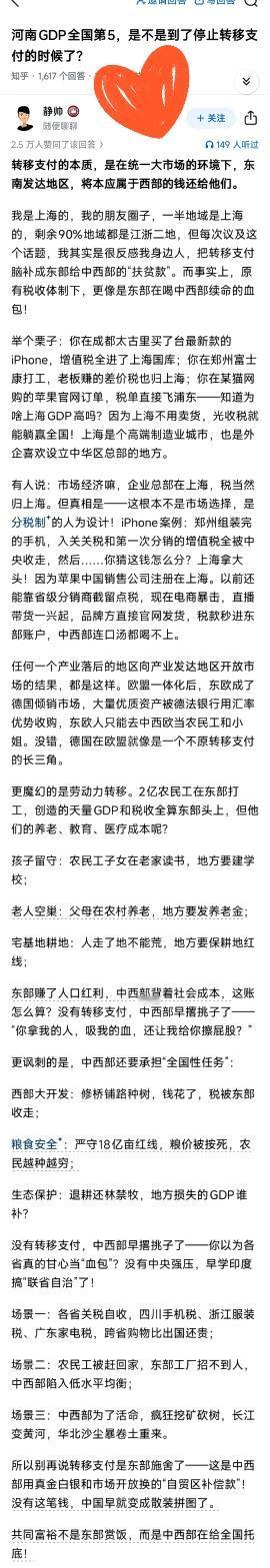 我看了一篇写关于支付的分析文章。“转移支付的本质,是在统一大市场的环境下,东南发达地区,将本应属于西部的钱还给他们”。 这话点透了中国区域发展的深层逻辑。咱别光盯着GDP排名看,河南GDP全国第五,可背后是一亿多人口的民生担子,是粮食安全的压舱石责任 。 东部沿海的繁荣,离不开中西部的资源输血。新疆的油气、山西的煤炭,顺着管道、铁轨流向东南,撑起工厂的日夜轰鸣。这些资源要是搁在国际市场,中西部本可赚得盆满钵满,可因为全国一盘棋,低价甚至无偿供应,这账咋算? 税收分配更藏着门道。上海作为金融、总部经济高地,收着全国产业链的税,可这些企业的生产基地、劳动力来源,大多在中西部。就像郑州富士康,给苹果打工创造的价值,税收大头进了东部口袋,河南留下的是辛苦钱,还有环境、人力的消耗。 转移支付从来不是施舍,是拿回本该属于自己的东西。中西部守着生态红线、耕地红线,放弃了很多短平快的开发机会。陕西为保黄河生态,关停沿岸污染企业;河南为守18亿亩耕地,限制工业扩张,这些牺牲不得不用转移支付来补偿。 要是因为GDP排名就停了转移支付,相当于让中西部既流血又流泪。东部继续躺着收税,中西部民生难以为继,生态保护崩塌,最后全国产业链断链,谁也别想好过。 河南GDP第五,是一亿人拼搏的成果,更是扛着国家战略任务的勋章。转移支付不是该不该停的问题,而是该怎么更科学分配,让中西部的付出被看见、被尊重,让全国一盘棋越下越活! 各位读者你们怎么看?欢迎在评论区讨论。