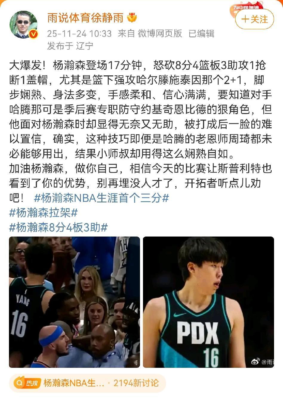 徐静雨是要把杨瀚森捧杀死吗!说他比雷霆的冠军中锋哈腾强! 今天杨瀚森虽然砍下了八分的数据,三分球却是六中一,防守端更是被点名打爆了! 面对这种数据徐静雨也大吹特吹,称杨瀚森一个二加一打爆哈腾,约基奇都打不了的人杨瀚森都能打,他是哈腾的小师叔,让开拓者教练不要再埋没人才了。 在解说时徐静雨就说他要想点限定词汇夸赞杨瀚森,势必要把杨瀚森夸的天花乱坠。