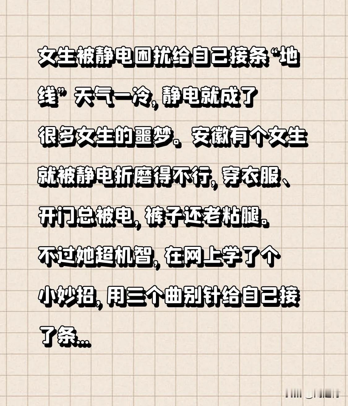 女生被静电困扰给自己接条“地线” 女生受静电困扰自制“地线” 天冷时,静电成了不少女生的噩梦。安徽一位女生深受静电折磨,穿衣、开门总被电,裤子还老粘腿。不过她很机智,在网上学了个小妙招,用三个曲别针自制“地线”,一端夹裤脚,一端垂在地上。别说,效果立竿见影,裤子不再粘腿,静电仿佛顺着“地线”溜走了。 实际上,女生更易受静电困扰,穿化纤衣物多、头发长,与衣物摩擦易积累静电。除接“地线”外,口袋放电池、袖口夹长尾夹也能防静电,原理都是为静电提供释放路径。还有人开门前摸墙除静电,也颇为管用。生活小妙招,有时真挺神奇! 如何让女生有触电的感觉?