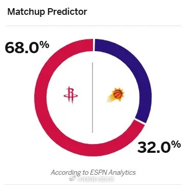 又奶!ESPN预测明日火箭vs太阳的比赛:火箭胜率为68%,太阳胜率32%