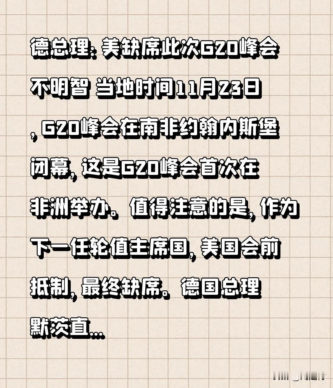 德总理:美缺席此次G20峰会不明智 德总理:美缺席此次G20峰会不明智 当地时间11月23日,G20峰会在南非约翰内斯堡闭幕,这是G20峰会首次在非洲举办。值得注意的是,作为下一任轮值主席国,美国会前抵制,最终缺席。德国总理默茨直言,美国缺席并不明智。 峰会期间,世界格局重新排序,新联系不断形成,美国参与度有限。此次峰会讨论内容丰富,美国仅在闭幕“交棒”时被顺带提及。会场内外,美国国旗被置于最靠边位置。峰会通过的宣言强调多边合作,美国此次缺席,可谓“聪明反被聪明误”。 为何美国缺席G20峰会却遭到打脸