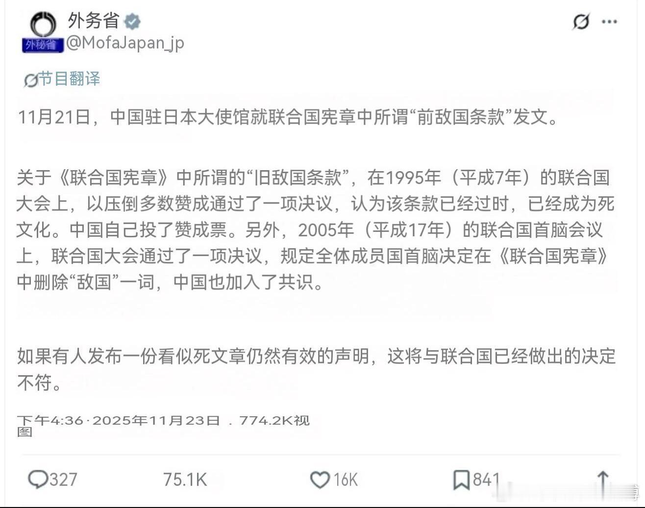 日本外务省发布声明称联合国“敌国条款”已经失效。“敌国条款”由《联合国宪章》第53条、第77条及第107条构成,其核心是针对德意日等法西斯或军国主义国家的任何一国有再次实施侵略政策的任何步骤,中法苏英美等联合国创始成员国有权对其直接实施军事行动,无须安理会授权。日本的意思就是,就算我实施侵略,中国也不能直接打我,必须要联合国授权。可事实是1995和2005年的两次投票,都只是建议删除“敌国条款”,但并没有实际删除,敌国条款依旧有效。要删除敌国条款,首先要2/3的联合国成员国同意,其次还要五常全部批准。也就是说,中国没同意,“敌国条款”就不可能被删除!只要日本有迹象实施侵略,我们就能直接进行军事打击!