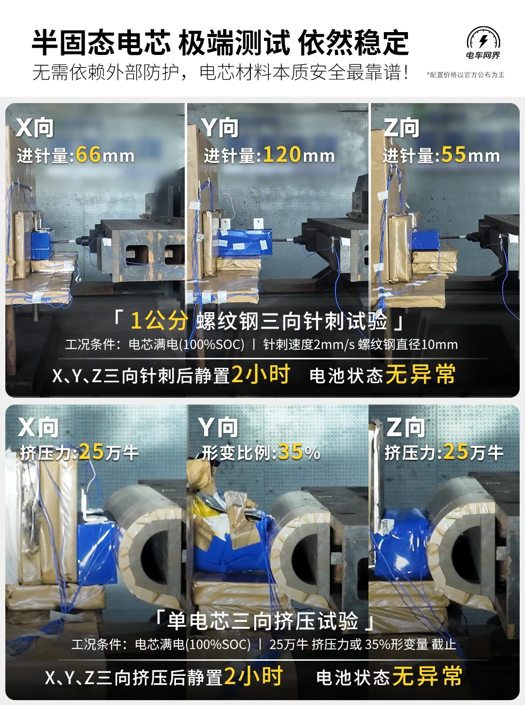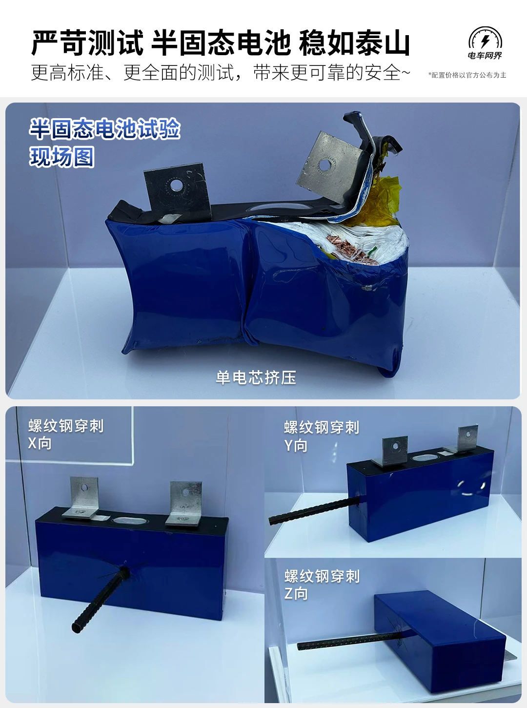 还记得上市发布会上展示的10针三向六面穿刺测试,当时电池就稳得让我印象深刻。而这次现场测试更极限,用一根一公分粗的螺纹钢筋对电池进行穿刺,结果电池包安然无恙。另一项电芯挤压测试更是残酷,电池都挤变形了,电芯内部结构都露出了,依然没有一丝燃烧的迹象。就算是现下行业公认最安全的磷酸铁锂也不敢这么造啊!