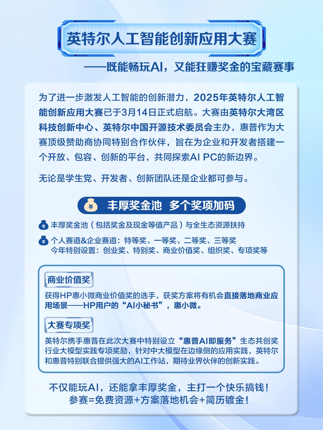 宝子们,挖到一个既能畅玩AI,又能狂赚奖金的宝藏赛事——英特尔人工智能创新应用大赛,由英特尔主办,惠普作为顶级赞助商协同腾讯等赞助伙伴联合发起[棒R]