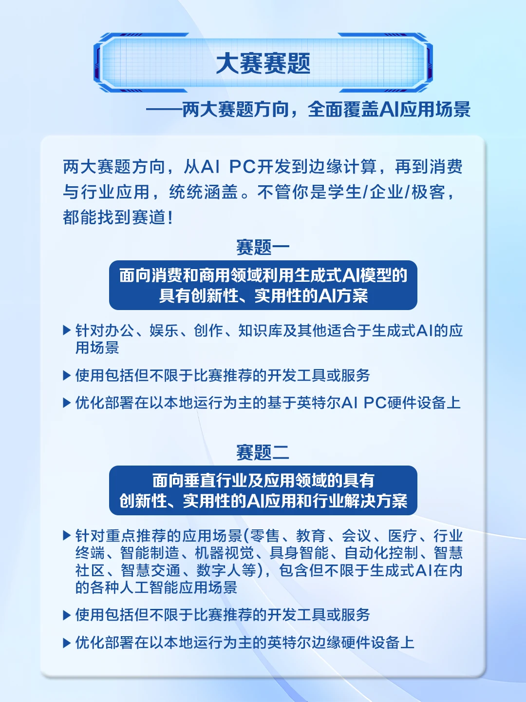 [种草R][种草R][种草R]AI应用场景全覆盖?两大赛题方向,从AI PC 开发到边缘计算,再到消费与垂直行业应用,统统涵盖。感兴趣的宝子可以看图上的具体参赛内容~哪怕没拿奖,参赛经历+技术认证也是求职利器,大厂HR抢着看!对ai感兴趣的宝子一定要试一试(报名以及详细规则指路-GW英特尔大湾区科技创新中心),参赛用机也可以提前体验起来,比赛时直接赢在起跑线!