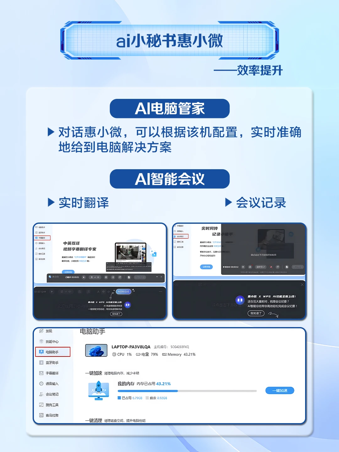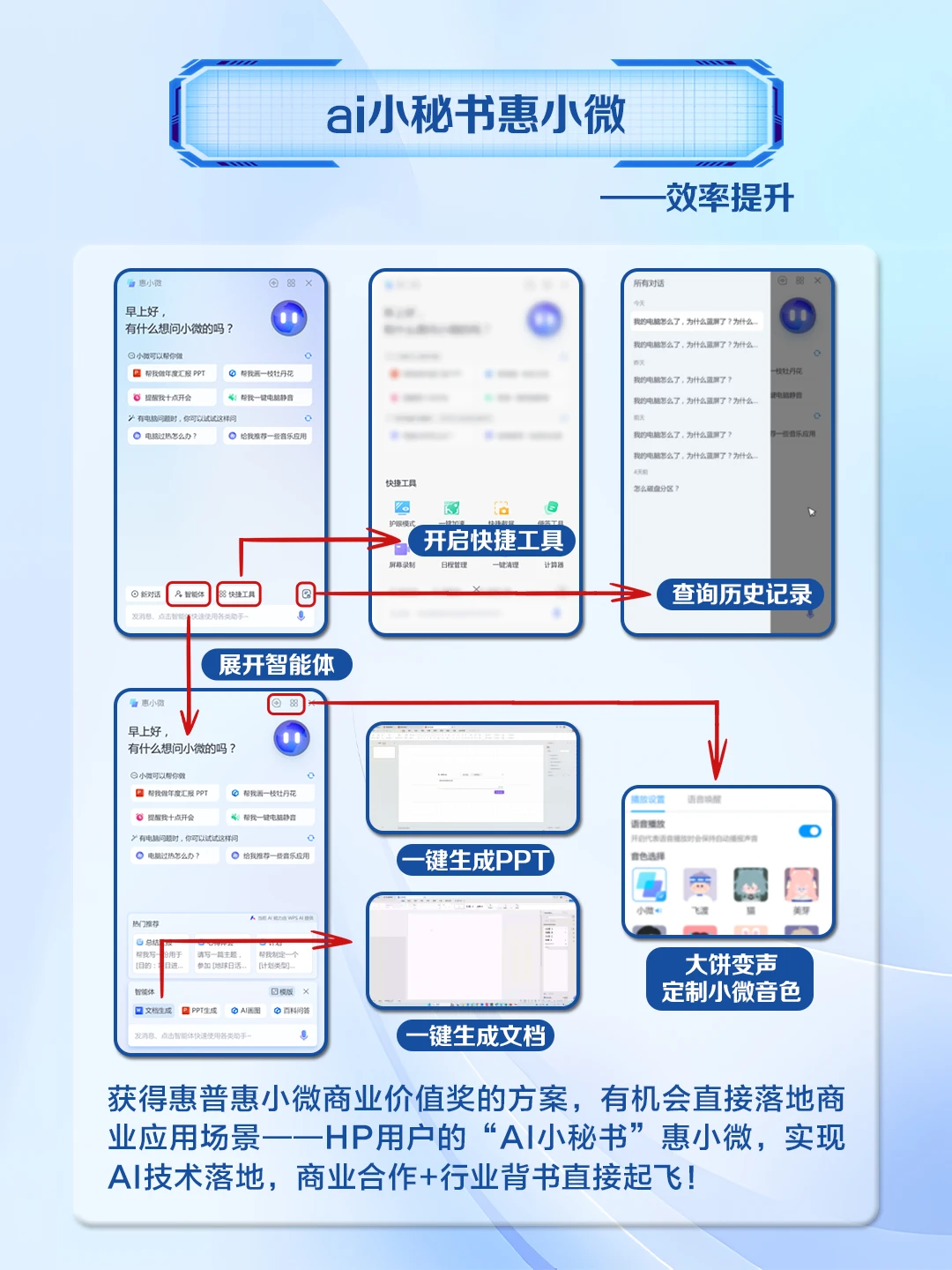 还有惠普专属AI小秘书惠小微帮忙,AI效率神器+AI智能会议+AI电脑管家+AI生活助理于一身,日常用惠小微写文案、做ppt,上课做记录、实时翻译,轻松搞定各种难题,一整个效率大提升[哇R][哇R][哇R]
