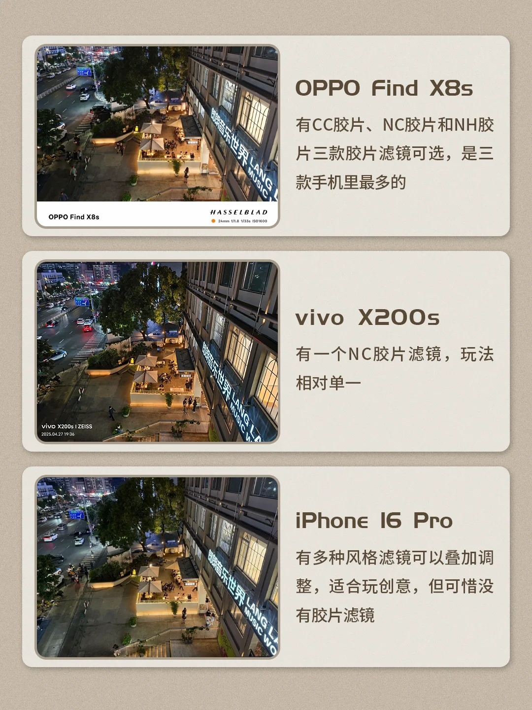 OPPO Find X8s:有CC胶片、NC胶片和NH胶片三款胶片滤镜可选,是三款手机里最多的
