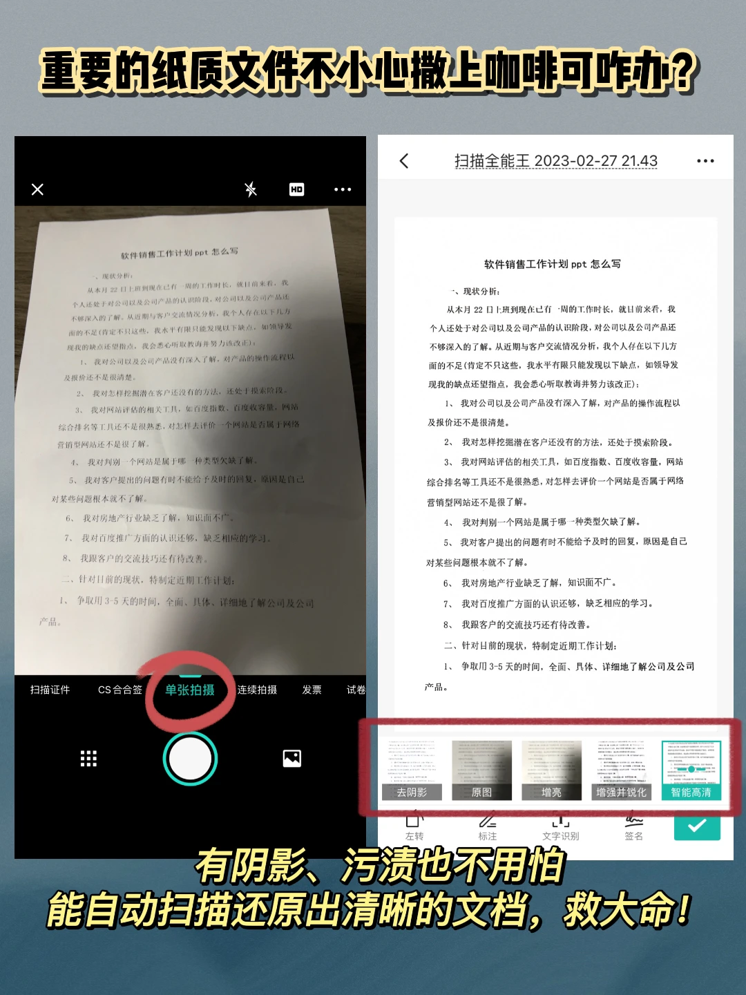 还有一次不小心把开会用的重要的纸质文件不小心撒上咖啡☕还好用它自动扫描能还原出清晰的文档,救我大命[赞R]
