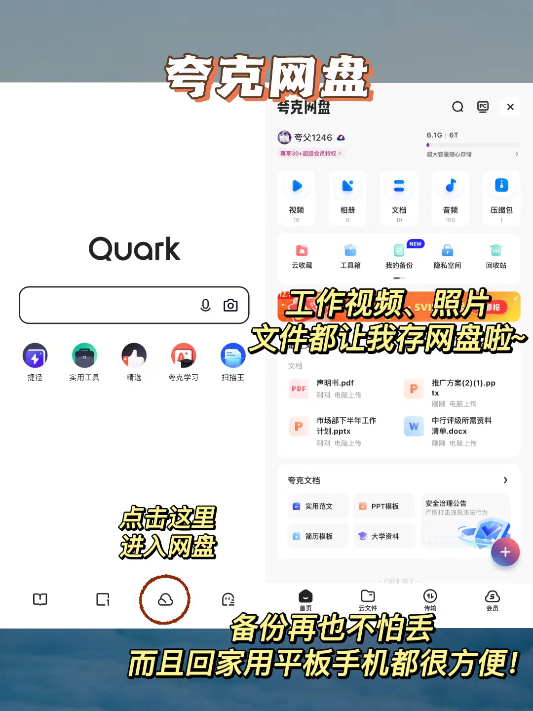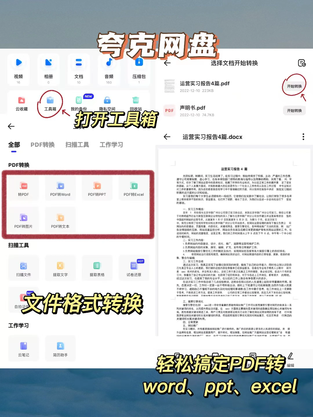 现在我都给丢进【夸克网盘】里了,哈哈~6T大空间,上传速度高达50m/s!解放手机内存还不怕丢。而且我还发现工具箱里面有PDF转word、ppt、excel的功能!我真的给跪了!