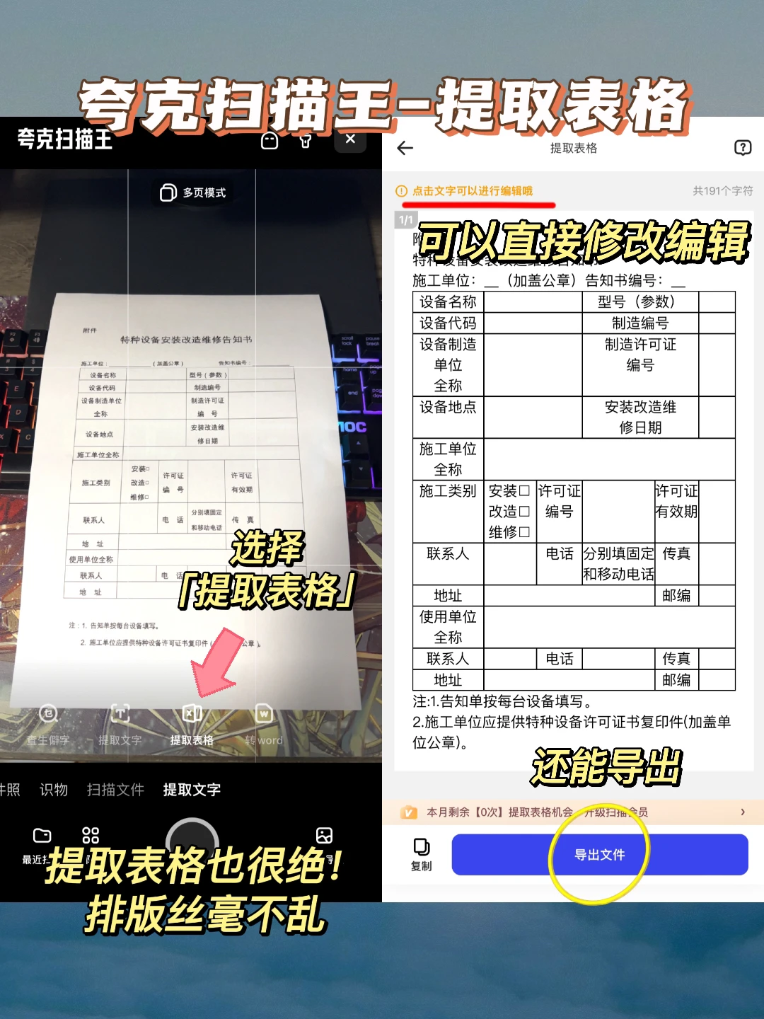 夸克里面的【夸克扫描王】,文件扫描自动摆正角度,又清晰准确;表格提取不用担心错行、还可以在线编辑、一键导出,咱就是说省事又省心!