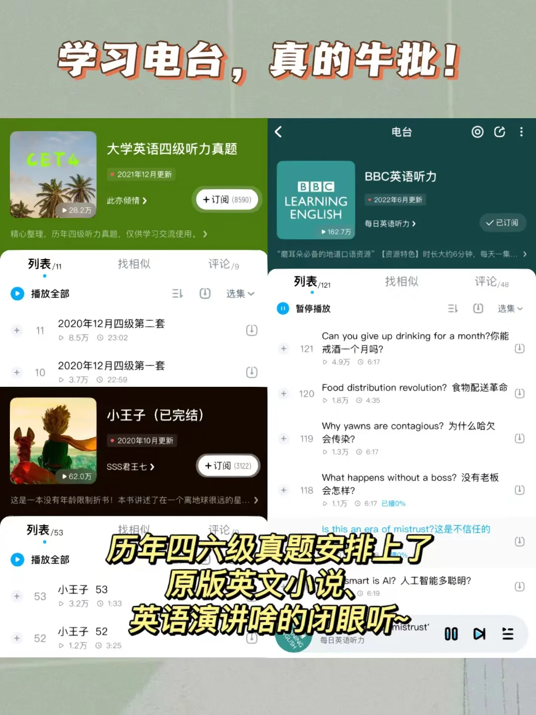 [星R]电台里有好多学习的内容,像是英语原版书、英语演讲、考试真题、单词啥的,别的地方可是要花钱才能听的资料,这里居然能免费听!