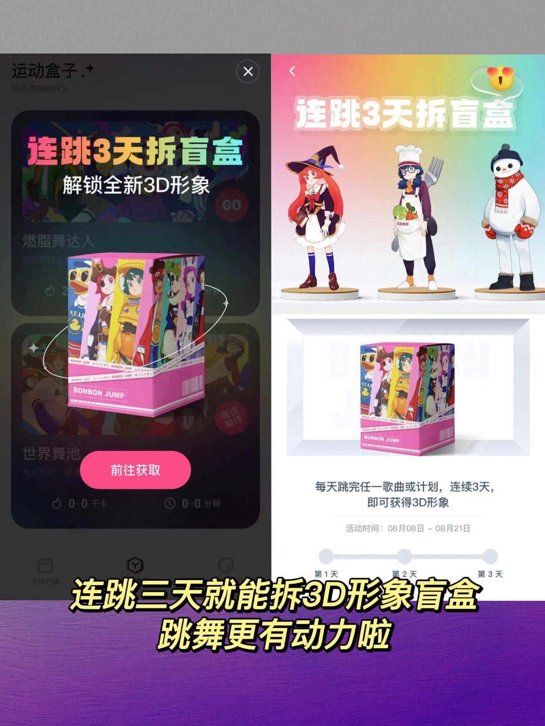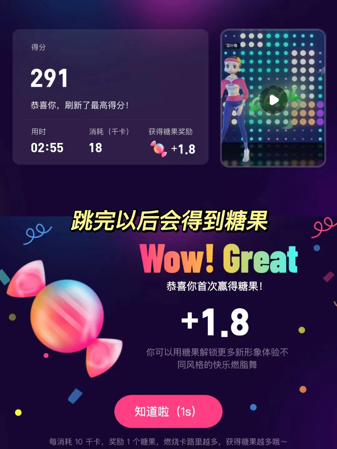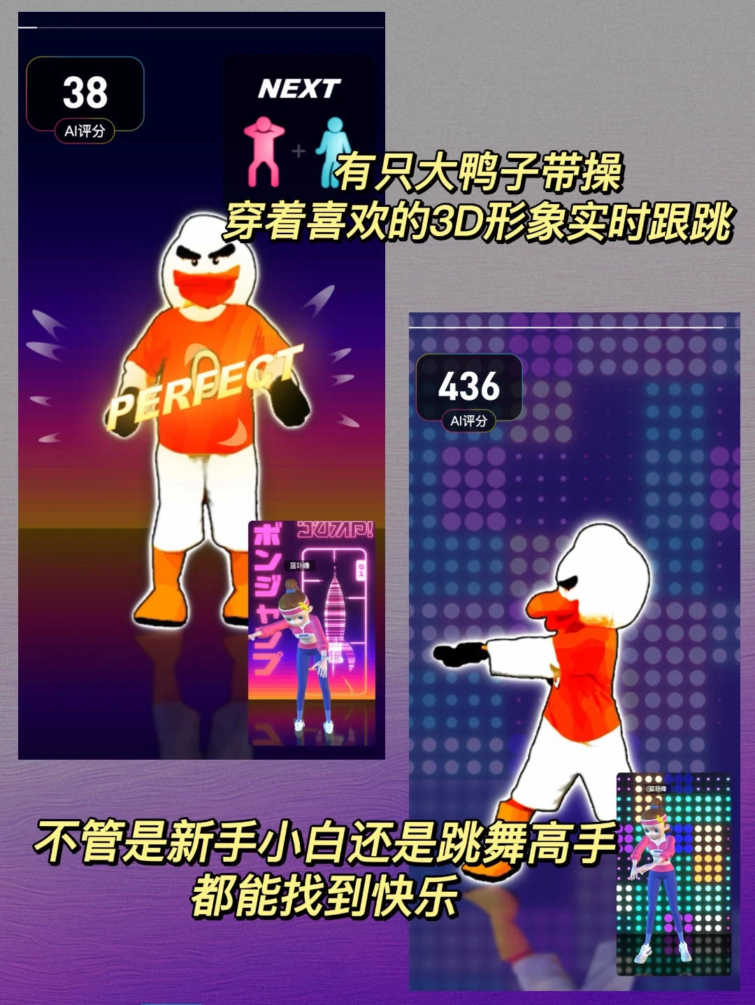 [赞R]有只大鸭子带操,穿着喜欢的3D形象实时跟跳,跳的过程中有AI根据动作打分,跳完以后会得到糖果,攒着糖可以用来兑换形象装扮。连跳三天就能拆3D形象盲盒,跳舞更有动力啦!