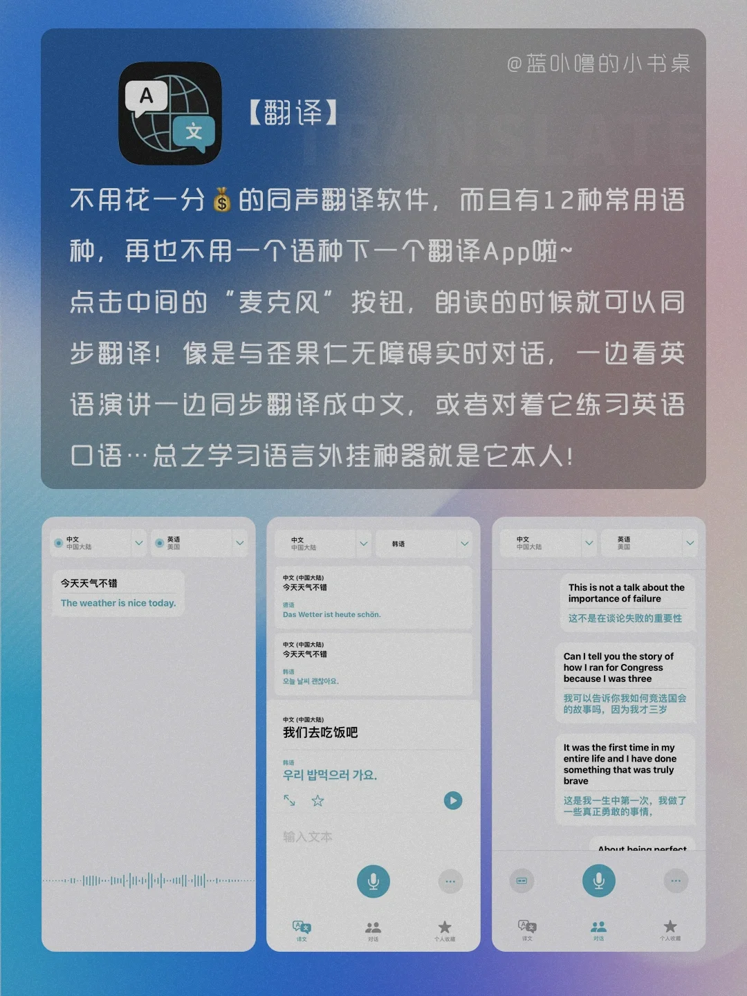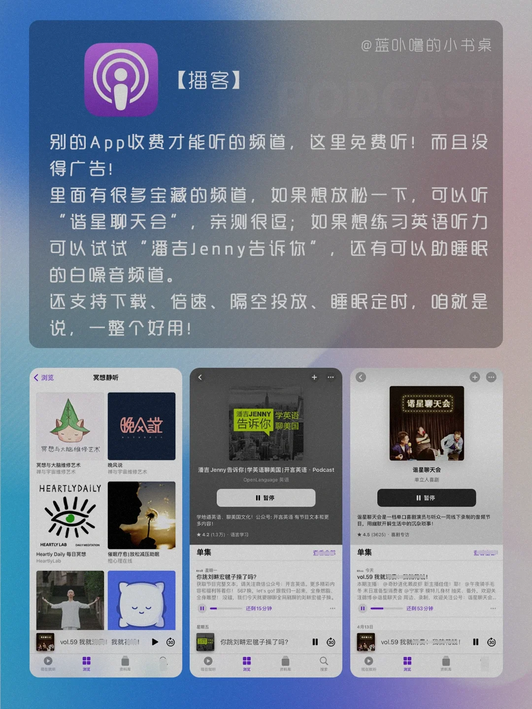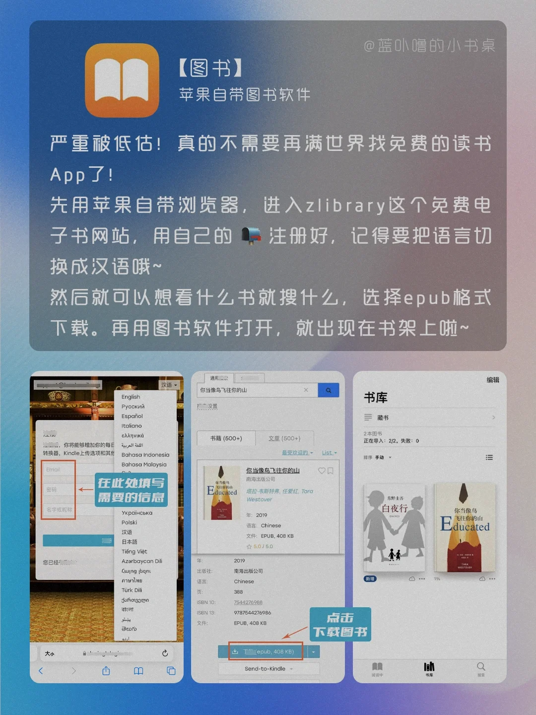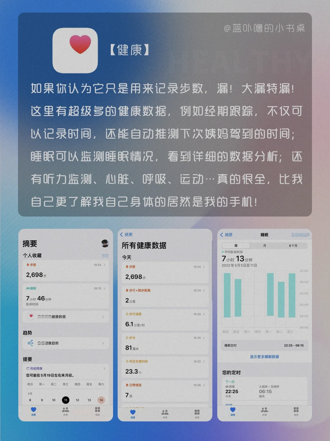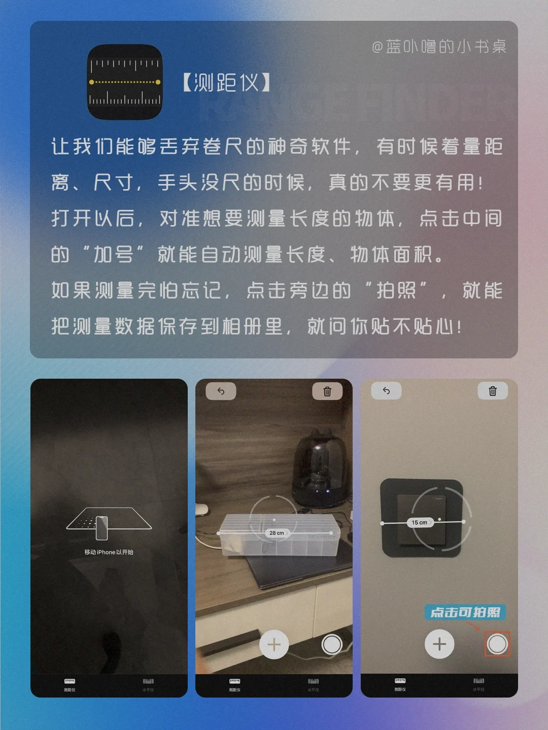 Hi,我是蓝卟噜的小书桌[飞吻R] 是不是很多人和当初的我一样,不知道怎么用苹果自带App,觉得没用就直接删了🥺 那可就错过免费又好用的App啦‼️‼️‼️ 用法和教程都在图👆🏻 📖图书 📶播客 🇬🇧翻译 📐测距仪 📝提醒事项 🏥健康